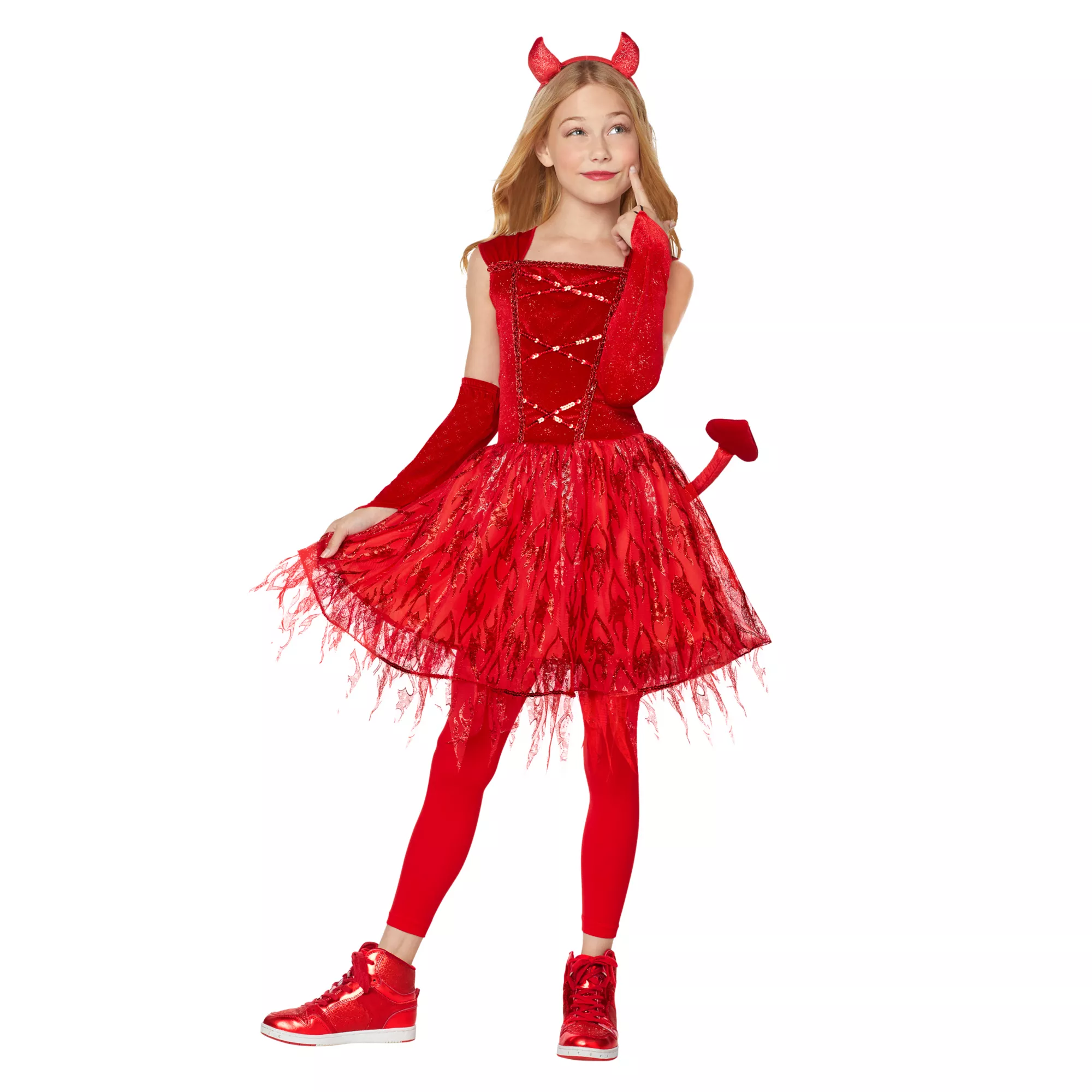This beautiful devil costume will turn your little one into a Halloween dream! The sleeveless dress features a tulle skirt with a tattered hemline and heart detail. With a sequin design on the bodice, your little one will always stand out in the crowd. Add the included headband, glovettes, and footless tights for the perfect Halloween look.