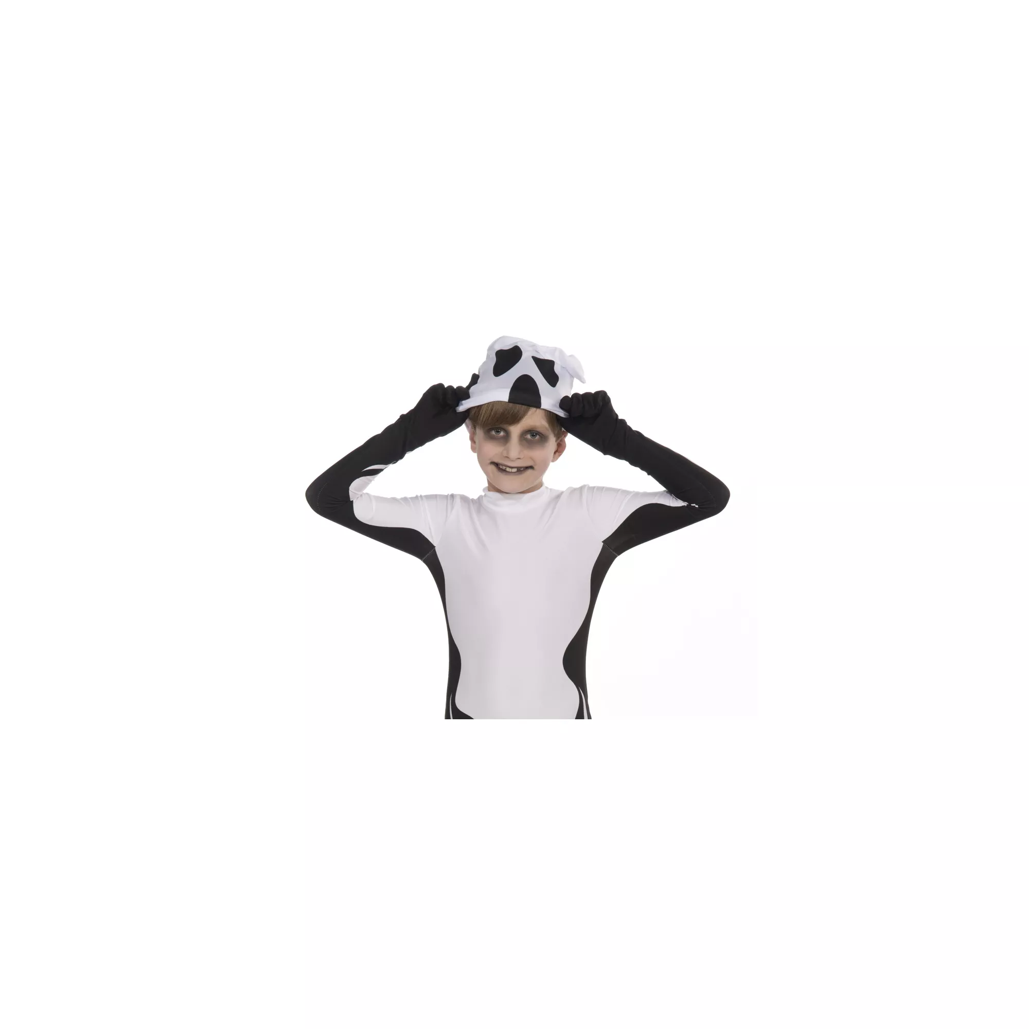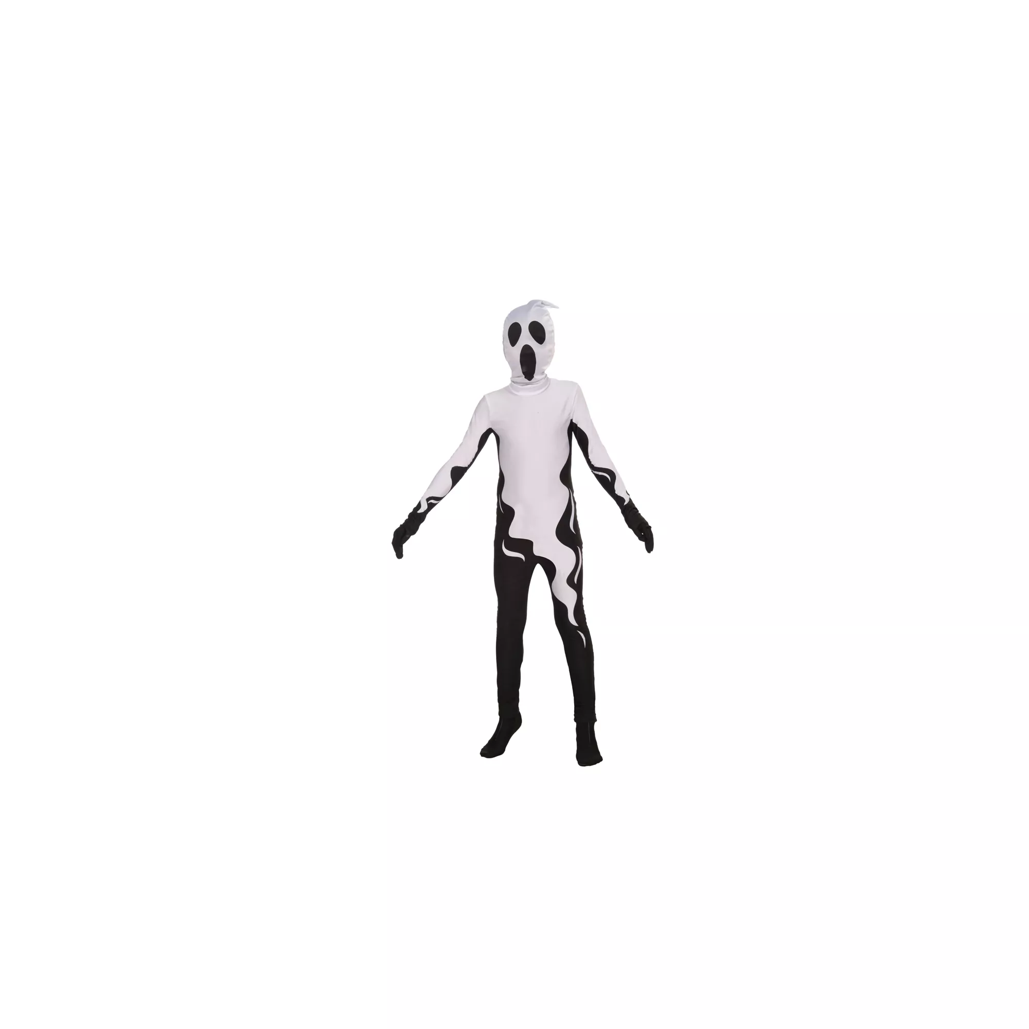 Redefine yourself as a spooky specter on Halloween when you wear this Floating Ghost Super Skin Child Costume. Black and white full body jumpsuit features attached gloves and socks, complete with a hooded mask.