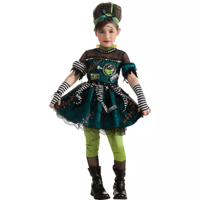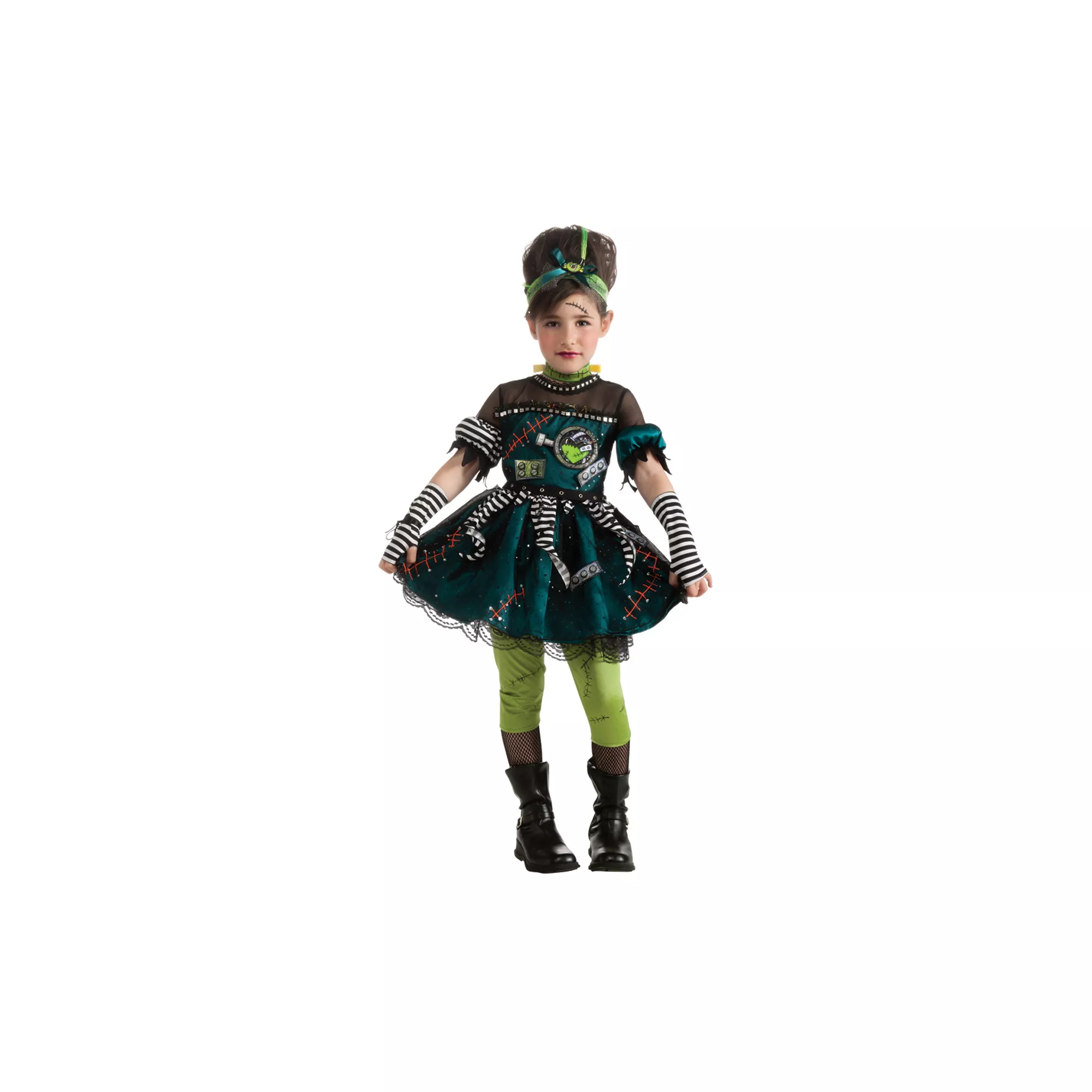 Capture all the attention on Halloween in this creative and inspired Frankies Princess child costume. The black, white, red and green dress includes a headband, glovelettes, green leggings with black stitches and a fun necklace.