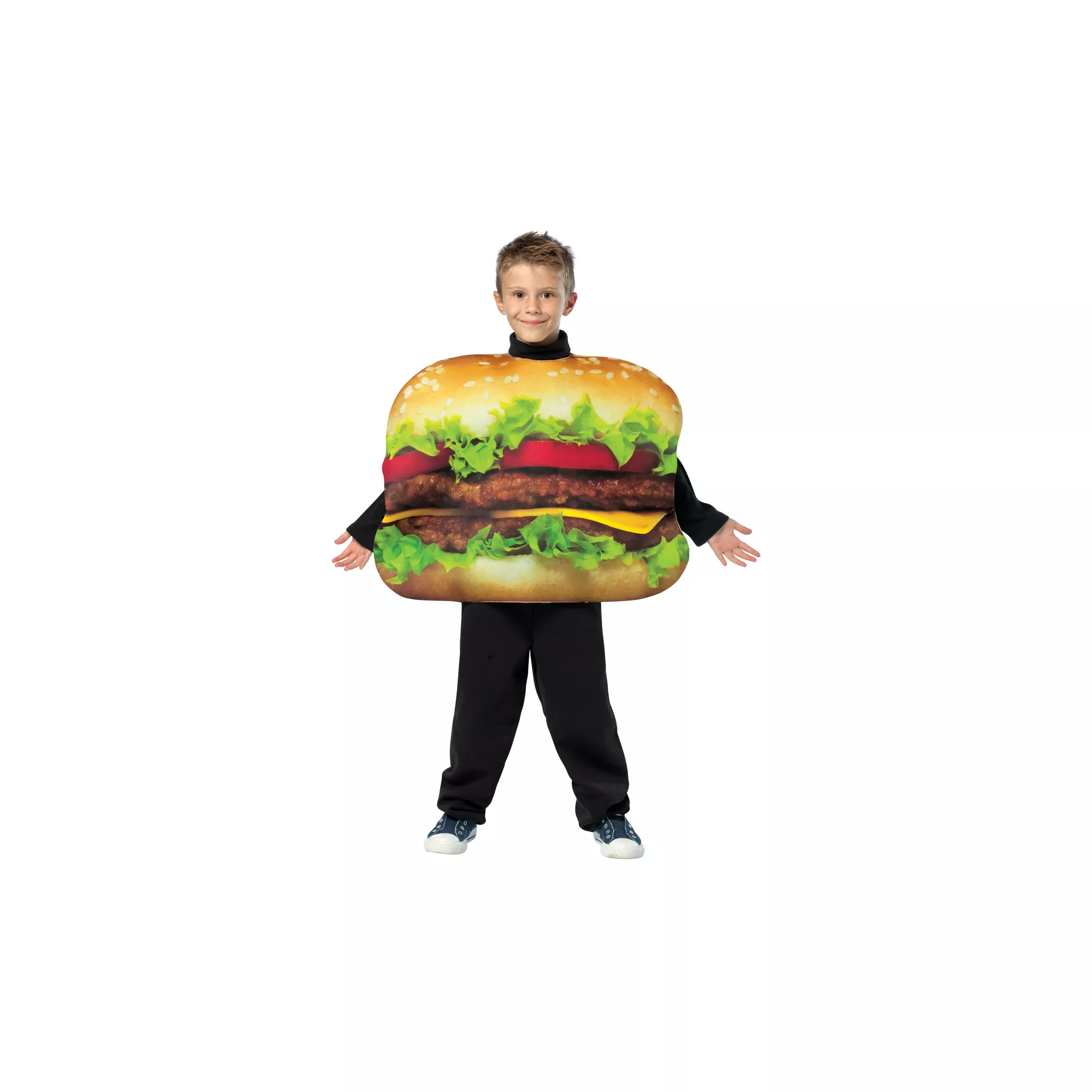 Savor Halloween when you wear this clever Get Real Cheeseburger boys costume - it's got everything on it! The comfortable tunic costume is a mouthful; better work on your tricks so you can get more treats.