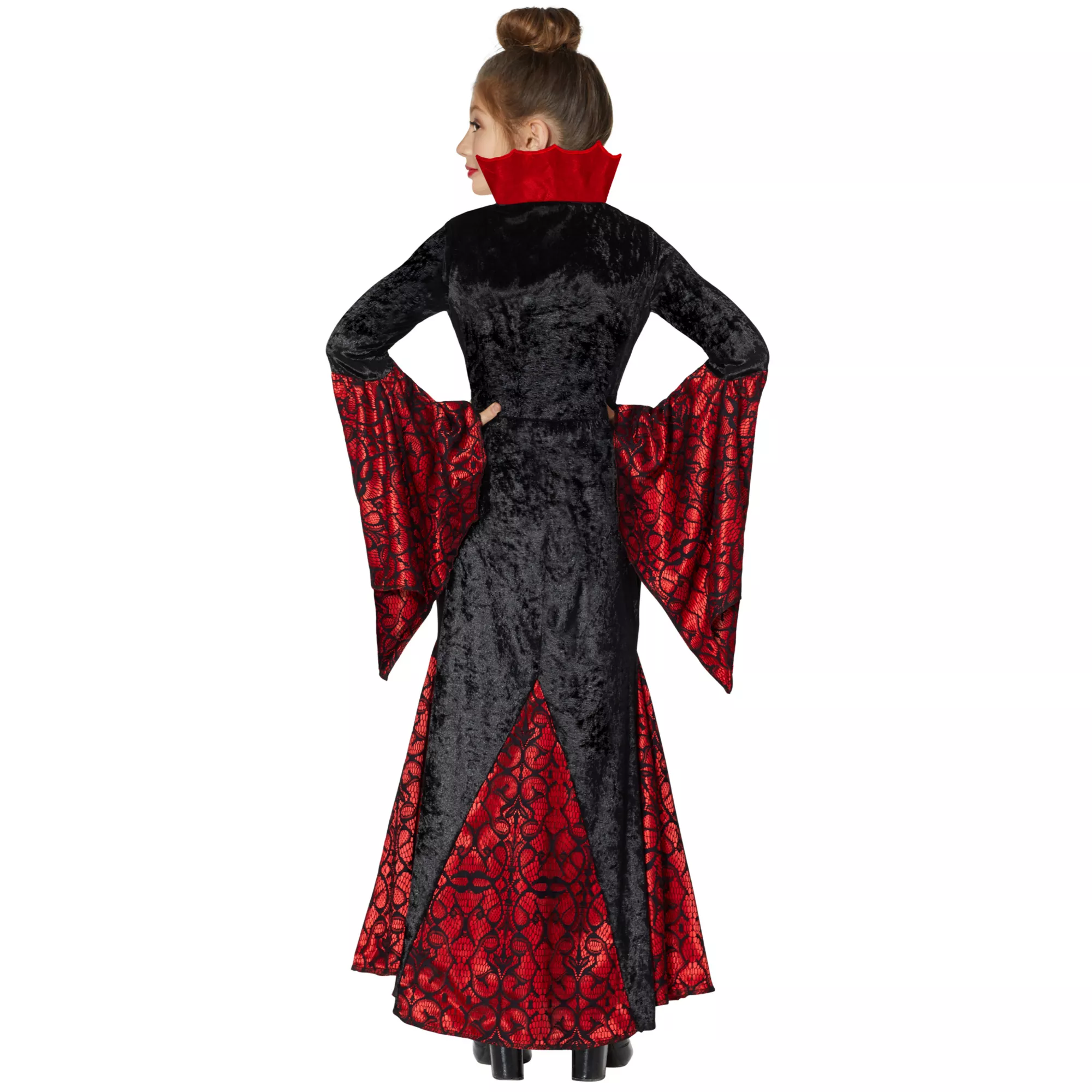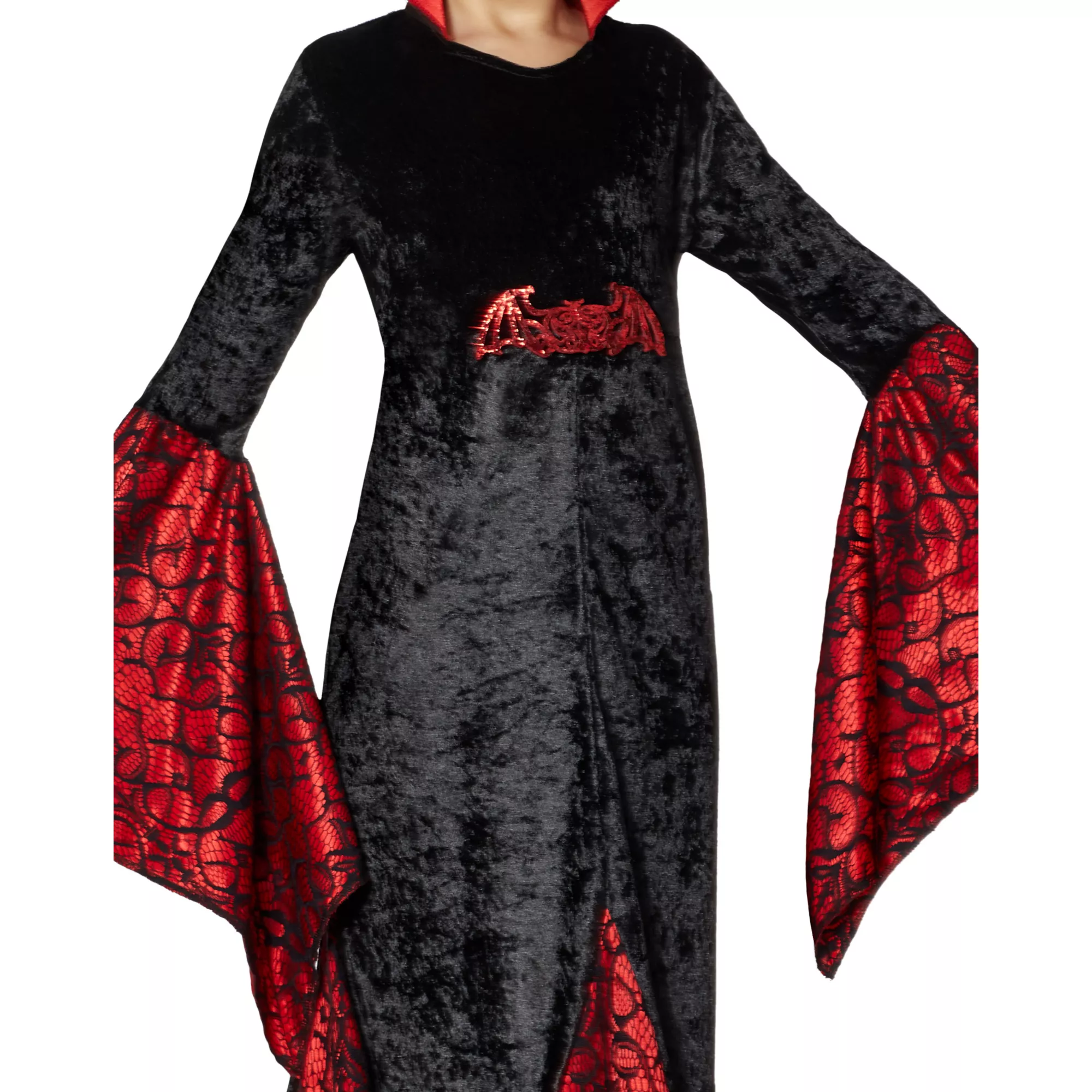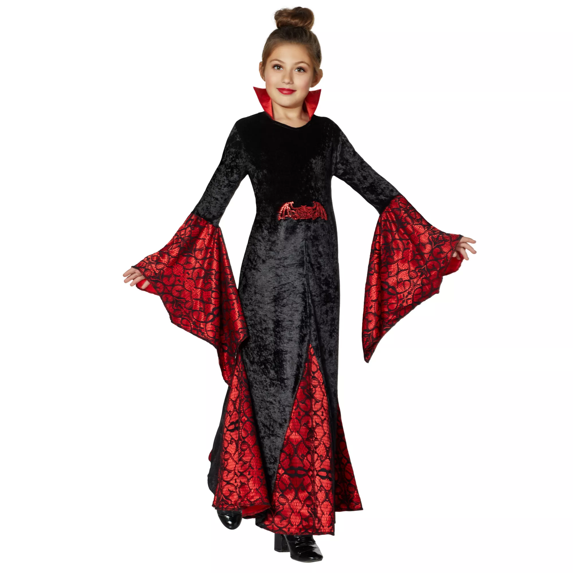“I vant to suck your blood!” Your little one will love walking around down in this gorgeous full length vampire gown! This velvet gown features a red underlay and lace detail that will have your child feeling like a princess! Bell sleeve detail and glitter accent will add to the character and make this Halloween the best one yet.