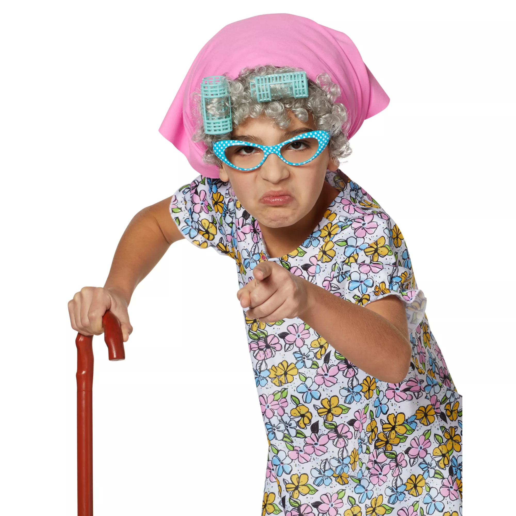 Spoil your grandkids or complain about the kids in the neighborhood! This silly Grandma costume is perfect for your Halloween! Slip into the floral dress and add the hair rollers, hip padding, glasses, handkerchief and socks for the perfect look! You'll look like you've aged 60 years overnight!
