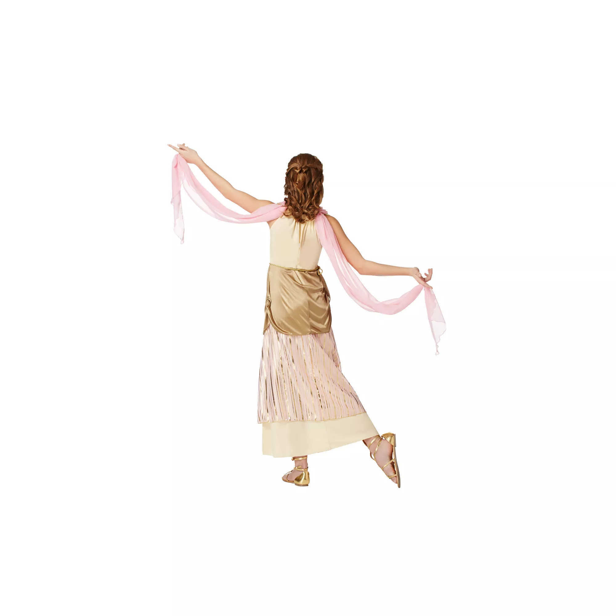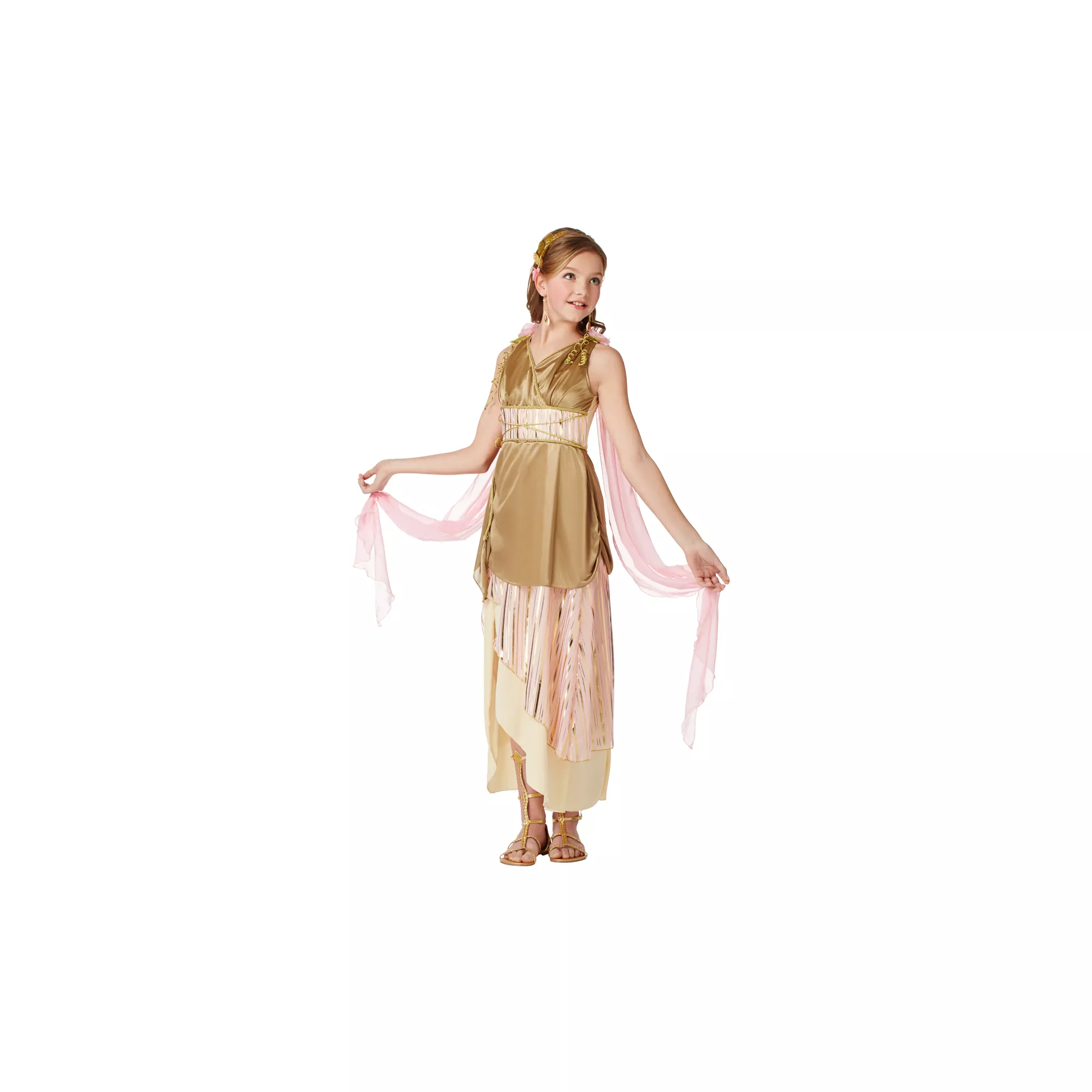Share your aura and beauty this Halloween in the Grecian Goddess Girls Costume. Features pink and gold gown with golden flecks, beautiful sheer arm drapes and a gold leaf headpiece.