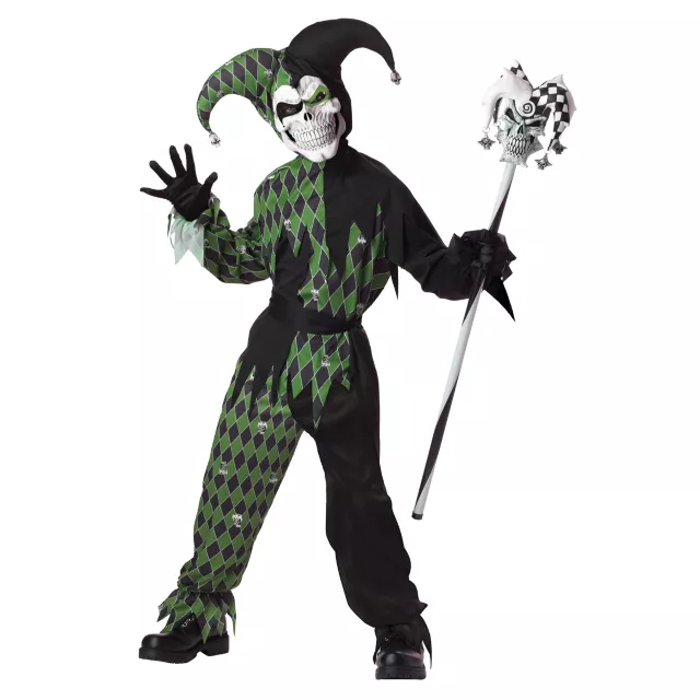 The joke will never be on you when you wear this Green and Black Jester costume! The checkered top of this jester costume features skull embellishments and comes complete with matching pants, a black waist tie, headpiece with an attached collar and a creepy grinning mask. You'll definitely have the last laugh!