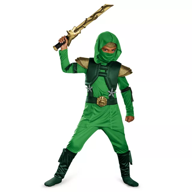 Dominate Halloween from the shadows when you wear the Green Master Ninja Deluxe Child Costume. Trust your stealth in this green, polyester jumpsuit, complete with vacuform buckle, 2 shurikens, chest piece and fabric mask. Your instincts will make gathering candy a simple task.