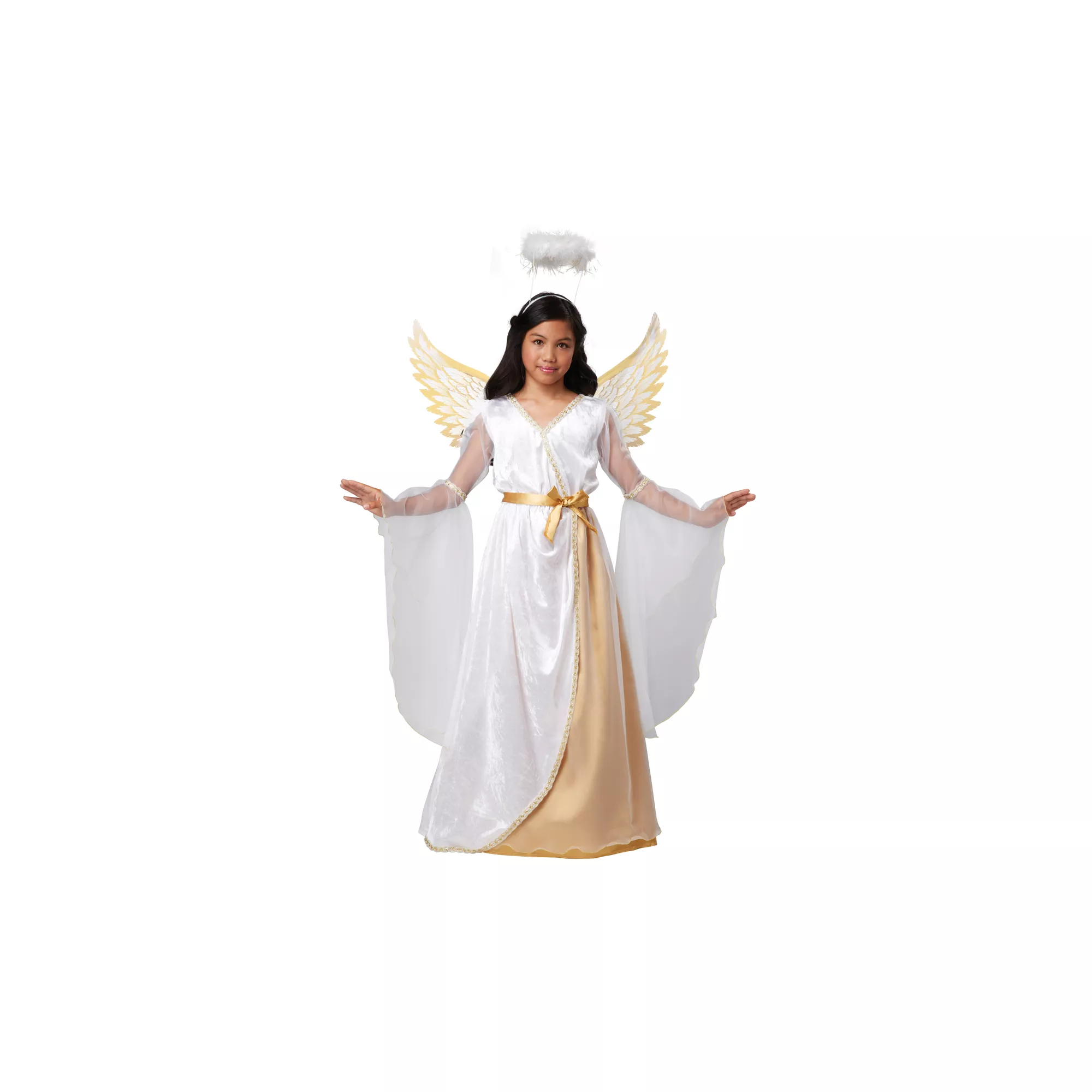 Flutter into Halloween with your gorgeous gold wings. The Guardian Angel Child Costume lets you shine in this gold and white dress, with beautiful sheer arm detail and of course a pristine halo.