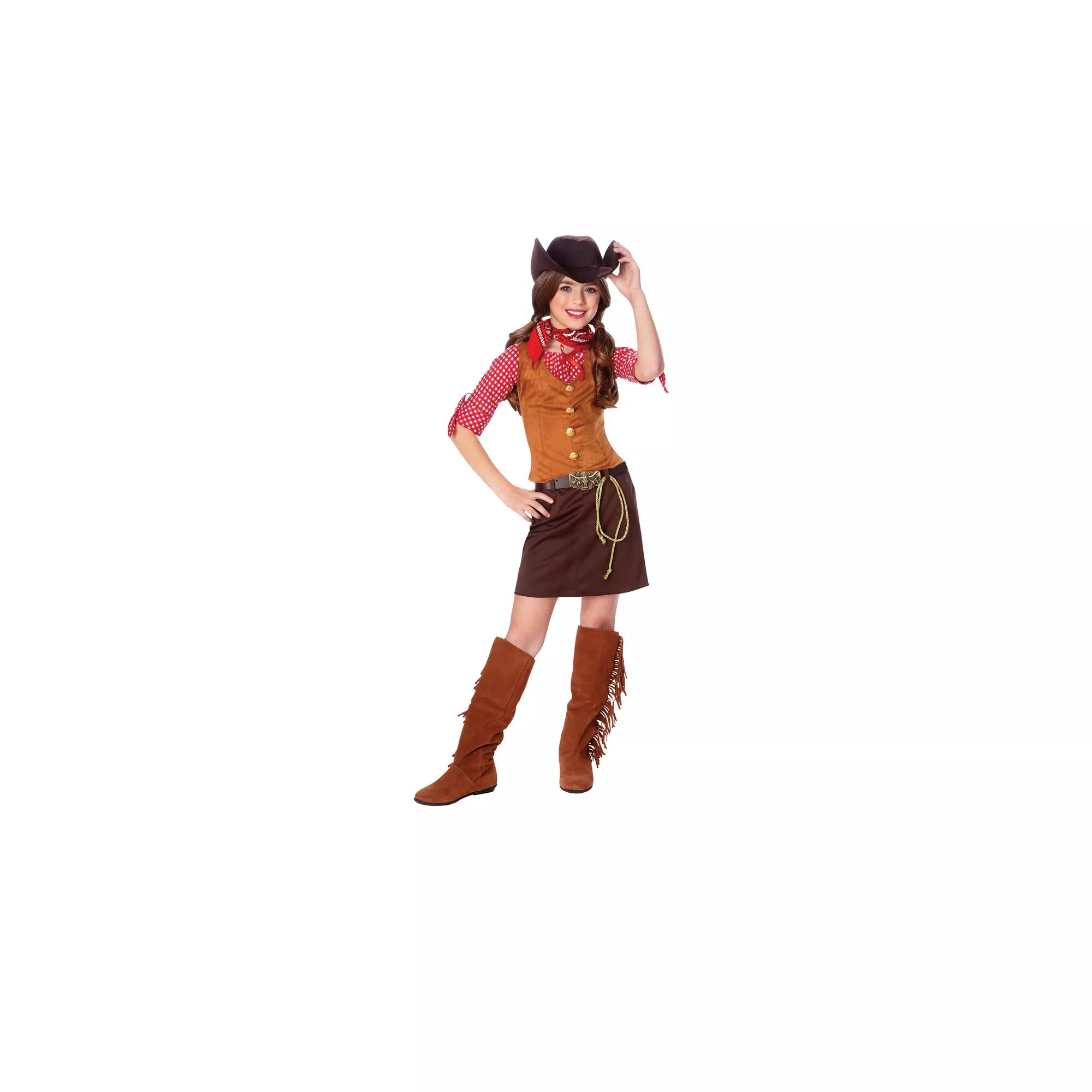 Trick-or-treat Wild West style in this authentic Gun Slinger girls costume. The faux suede vest with attached red and white shirt comes complete with brown skirt, belt and buckle, bandana and hat. Rustle up some Halloween fun in this classic outfit.