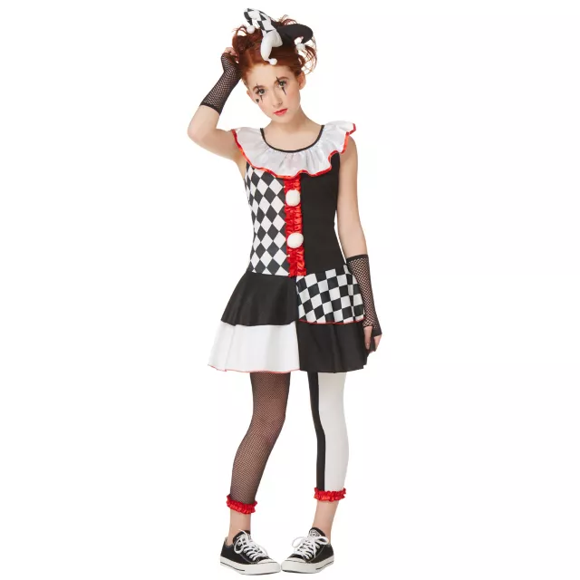 If you're the jokester of your group, then the Harlequin Jester Girls Costume is a perfect fit this Halloween. Amuse your friends in this black, white and red harlequin print dress with mix-matched pants and hat.