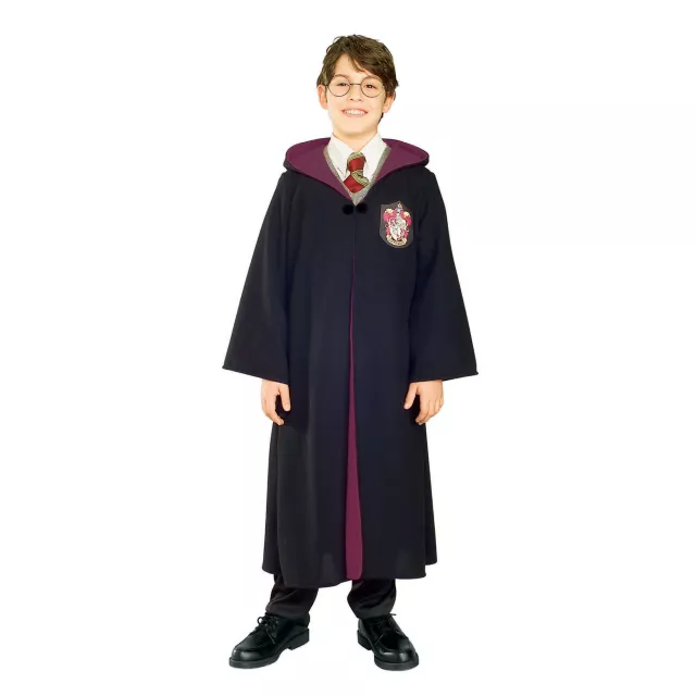 Don your robe for a Hogwart’s Halloween in this officially licensed Harry Potter deluxe robe child costume. The black and burgundy, 100% polyester robe features the Hogwart's crest and closes with a handsome clasp.
