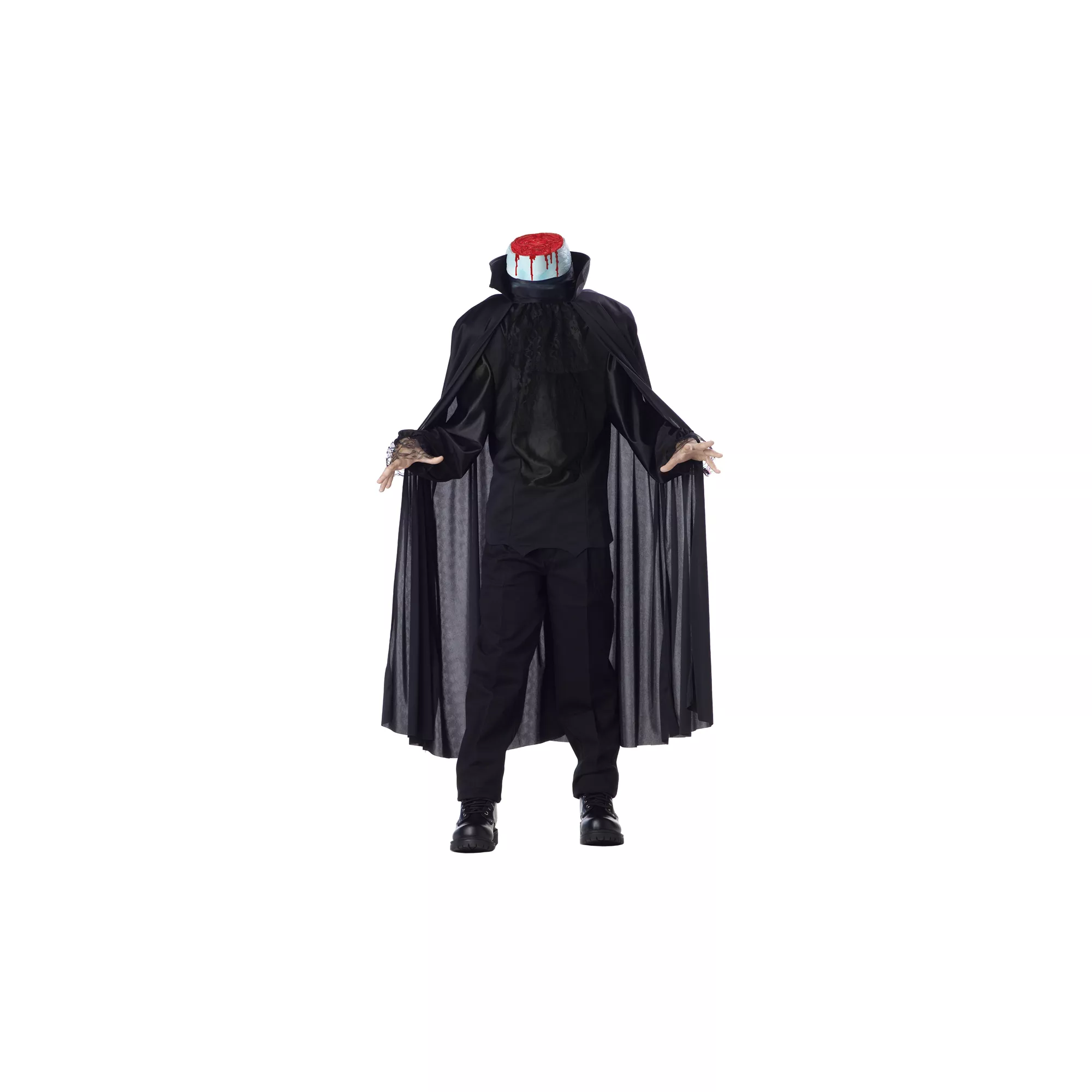 Haunt the neighborhood and spook your friends when you wear this classic Headless Horseman child costume. The black vest with sleeves, features an attached ascot and cape, and comes complete with headpiece and inflatable shoulder components.