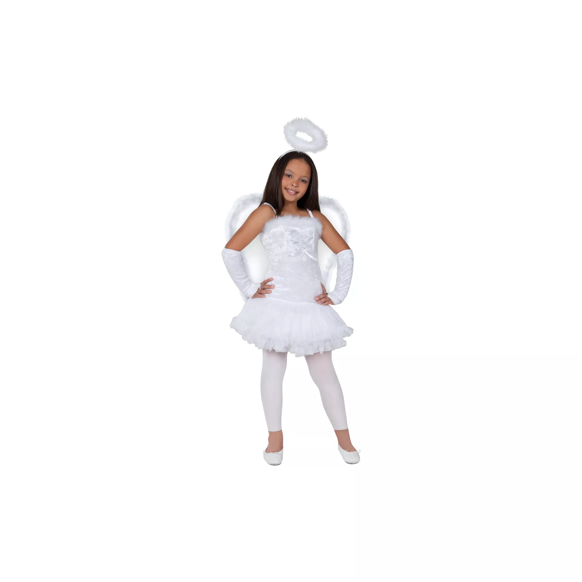 Be sweet, pure and innocent in this pretty, white, feather-trimmed Heaven Sent Angel girls costume. In this outfit you can get away with just about anything! The white, 100% polyester dress comes complete with skirt, white arm warmers, wings, halo and matching leggings.