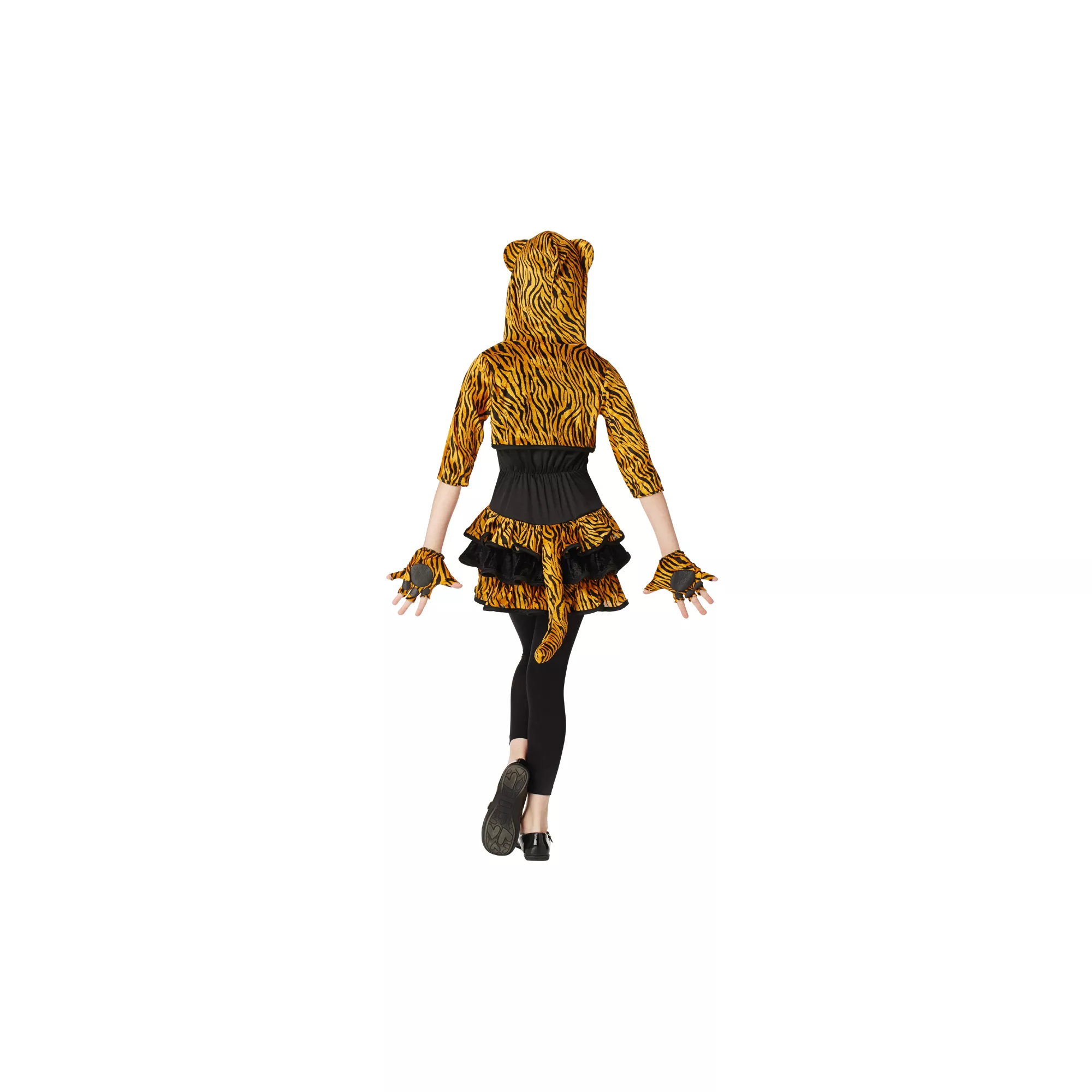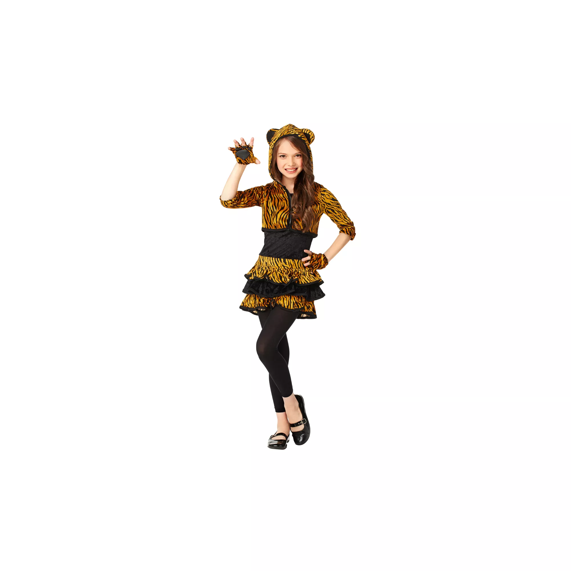 Heed the call of the wild in this innovative and impossibly cute Tigress Hoodie girls costume. Prowl the party in the hooded dress with attached tail and ears and stalk your prey wearing the matching gloves with paw-print palms.