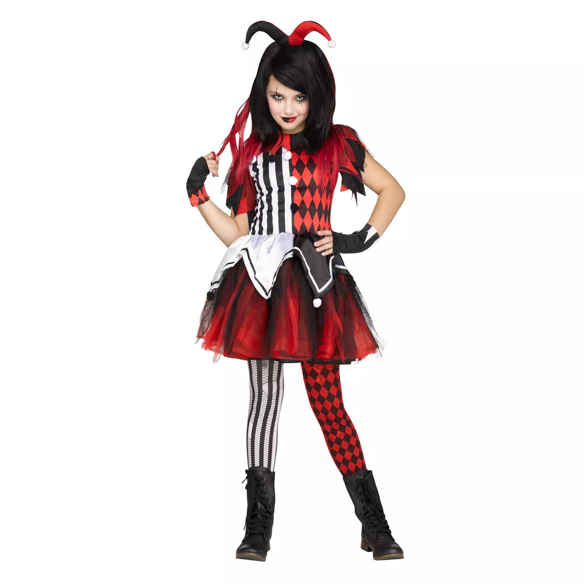 Take stylish and scary to a whole new level with this Horror Harlequin costume! The dress features a red and black design on one side of the chest and a white and black design on the other side, and the tutu flares out in red and black. This costume is perfect for any fabulously frightening harlequin!
