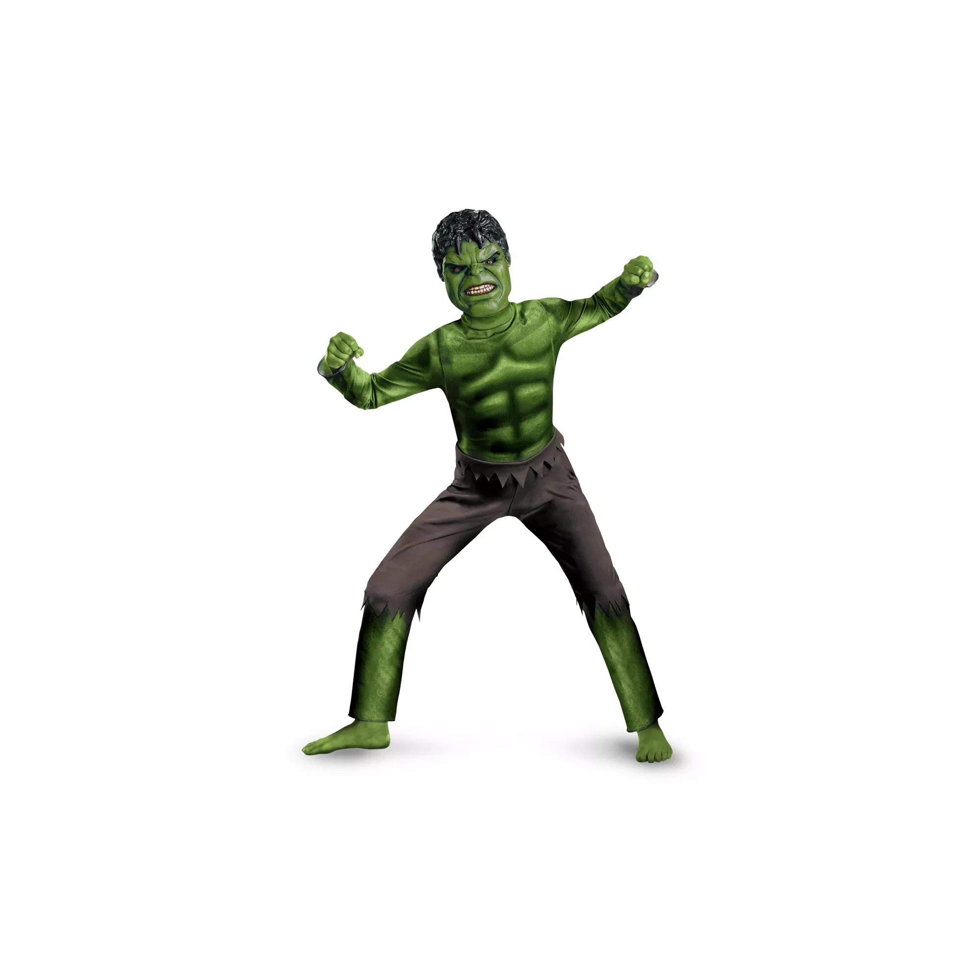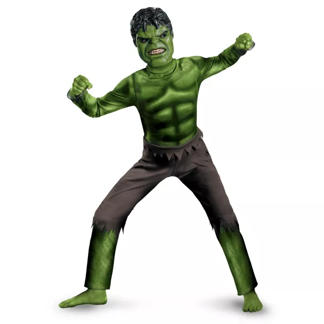 Battle your emotions and defend the world from disaster on Halloween in this officially licensed Hulk Avengers classic child costume. The green and black character jumpsuit comes complete with a matching character mask.