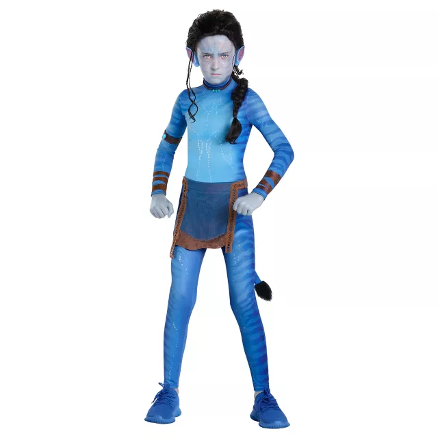 Protect the Na'vi tribe with this officially licensed Kids Jake Sully Costume! This movie-inpsired costume features an authentic blue skinsuit, cloth with attached tail, arm band, arm wraps, beaded choker, and ears.
