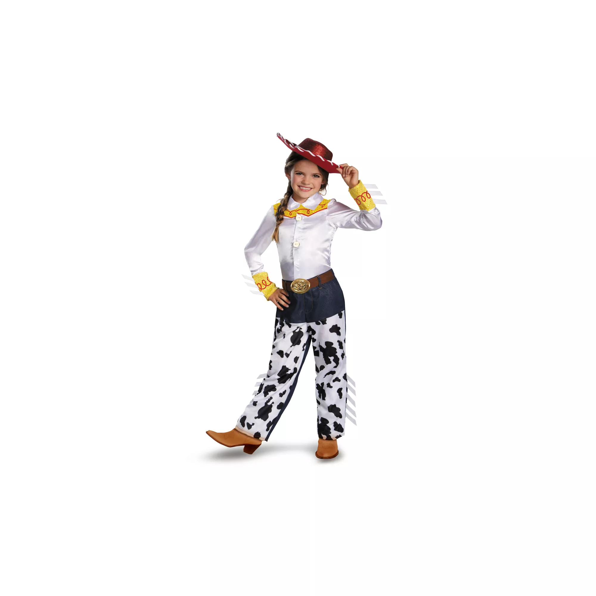 Round up the whole gang wearing this officially licensed Toy Story Jessie Prestige Child Costume complete with shimmery white blouse with classic western detail, fringed cow print pants, buckle belt, and red hat.