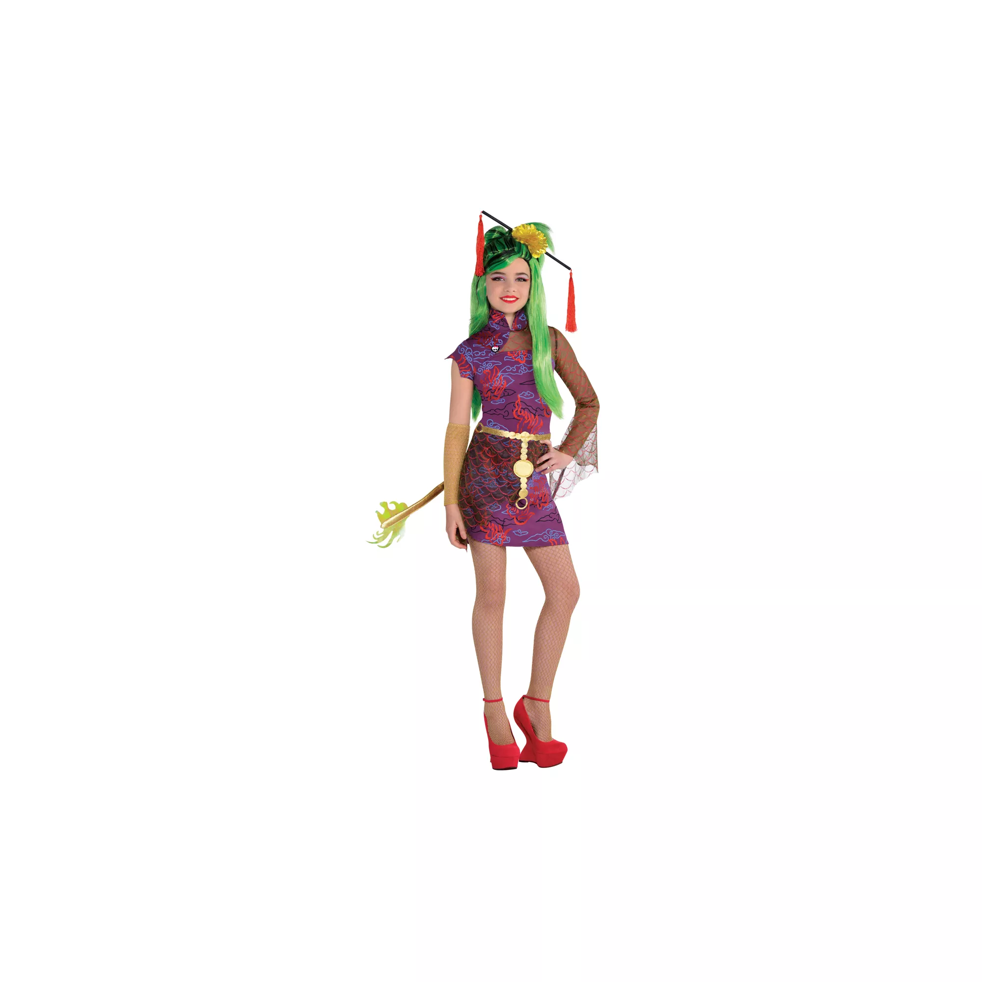 You'll be fiery, friendly and fashion-forward in the Officially Licensed Jinafire Long Deluxe Child Costume. This purple and pink kimono style dress with flaming dragon's tail, bright green wig and chopstick style headpiece will have all the Monster High students asking you for fashion tips.