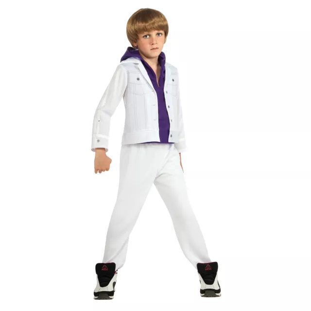 Behave anyway you like on Halloween when you wear this officially licensed Justin Bieber child costume. The white jean-style jacket of this pop star costume features an attached purple hoodie and comes complete with matching white pants.