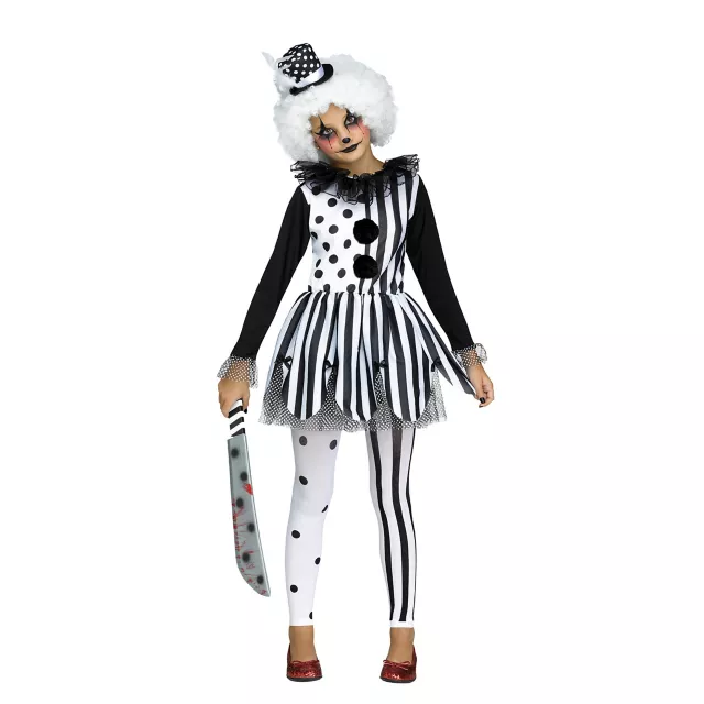 You'll be the one laughing this Halloween when you spook all your friends in this Kids Striped Clown Costume. This black and white costume features a half striped half polka dot clown dress, hat headband, and tights to complete the look. Anyone who's afraid of clowns will go running once they see you in this creepy outfit.