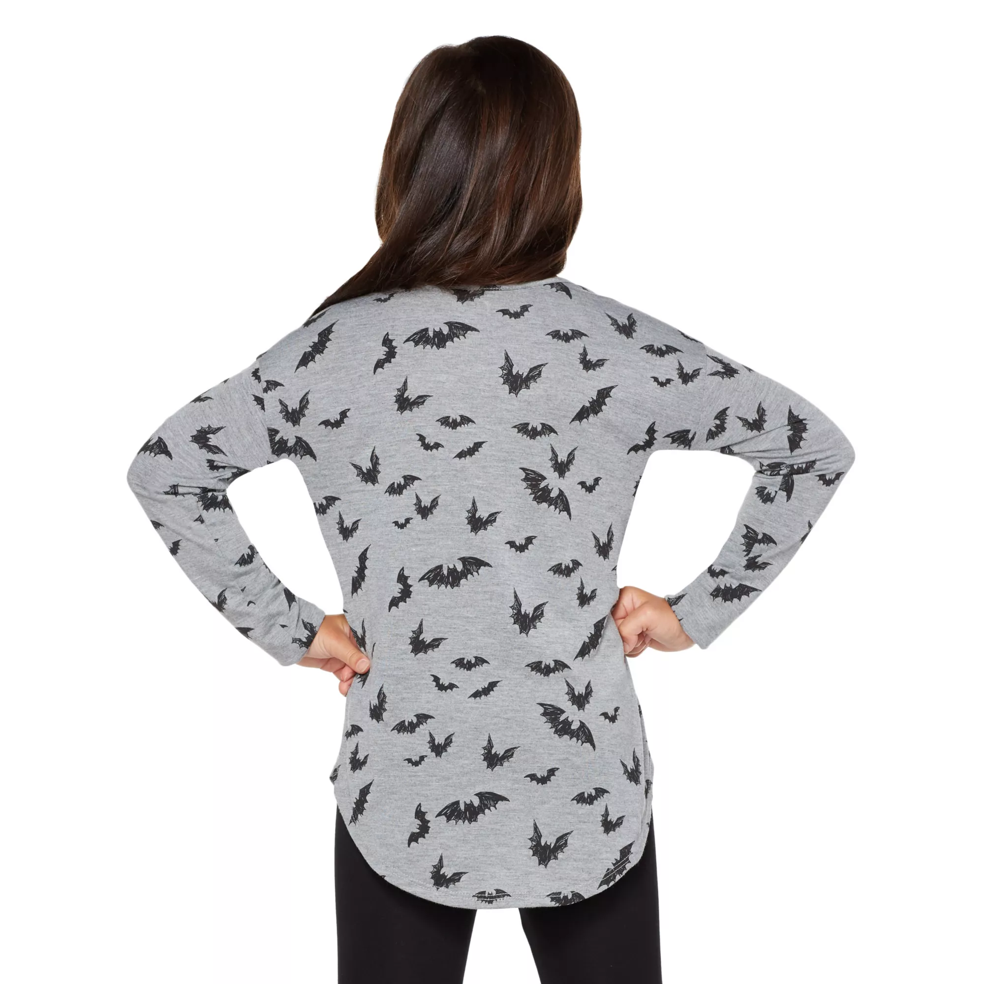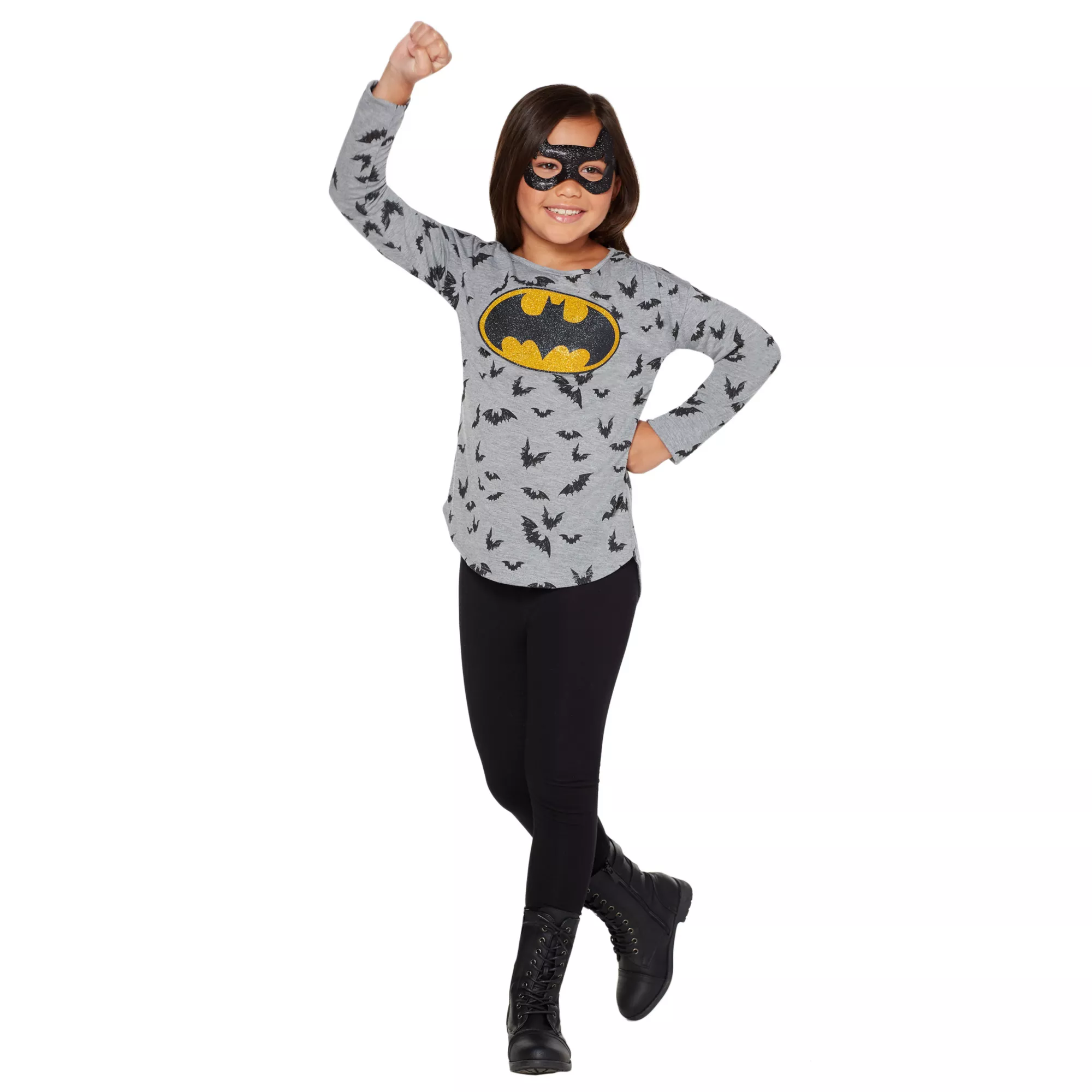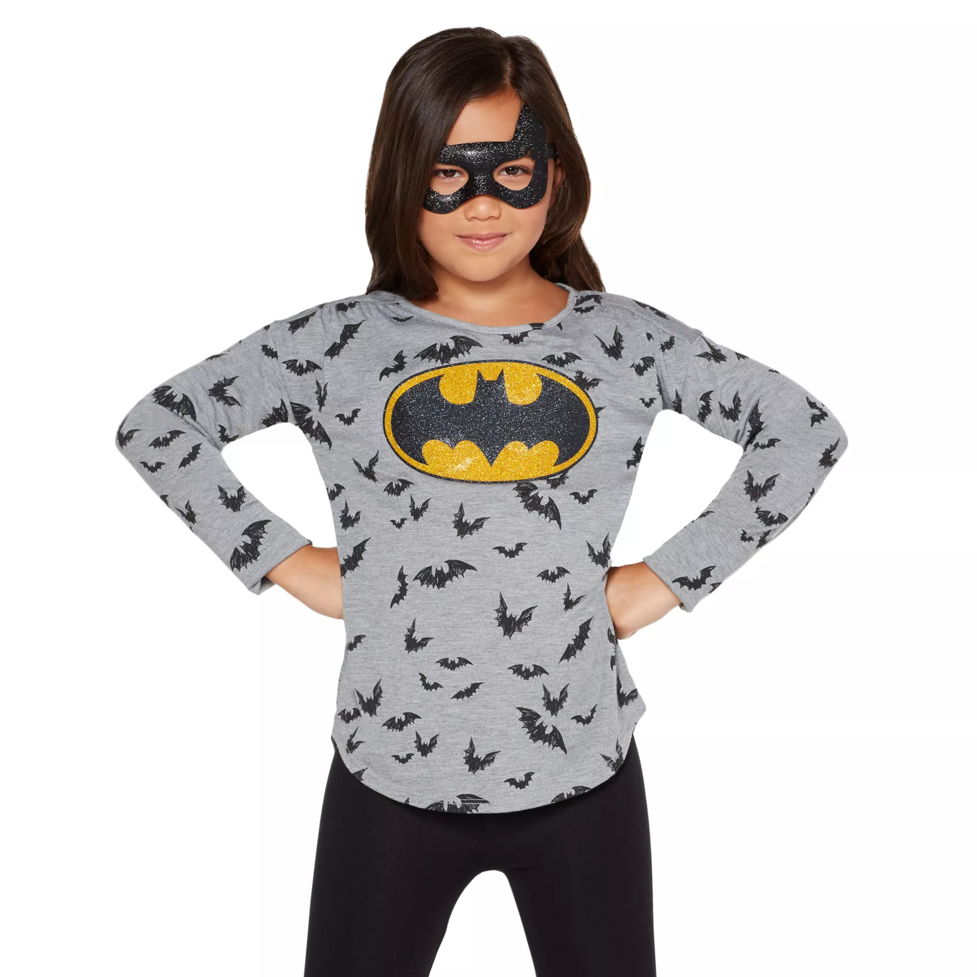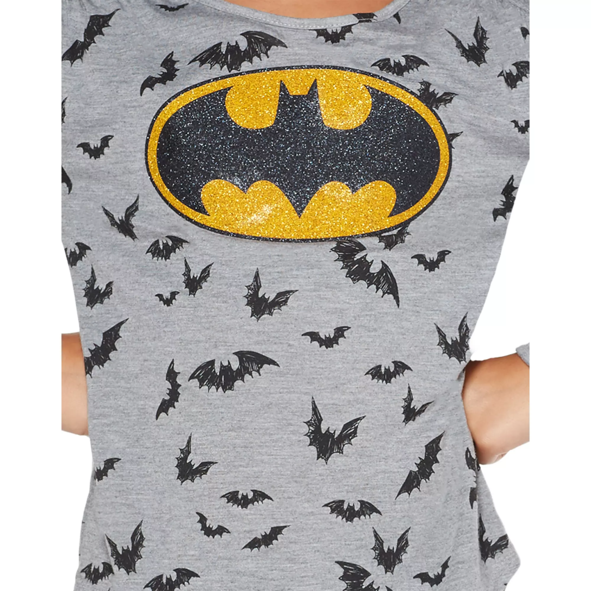 Go batty over this officially licensed Batgirl tee! The glitter chest logo and scribbled bat pattern will have any young crime fighter feeling ready to hit the streets of Gotham in style.