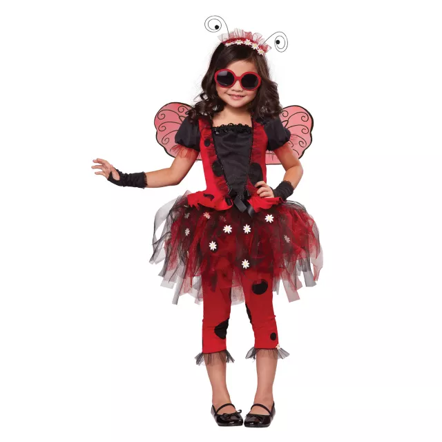 This little lady will be styling in the Lovely Ladybug Girls Costume. This red dress features a cooky polka dot print with matching leggings, full tulle skirt with daisy flower detail, wings, antennae and cool "bug-eye" glasses.
