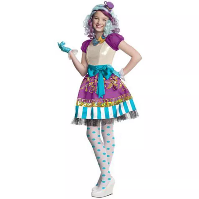 You'll look tea-rific in this Officially Licensed Ever After High Madeline Hatter Girls Costume. Show off your too cool for school style in this striped and polka dot outfit featuring a pretty dress, tights, gloves and a necklace.