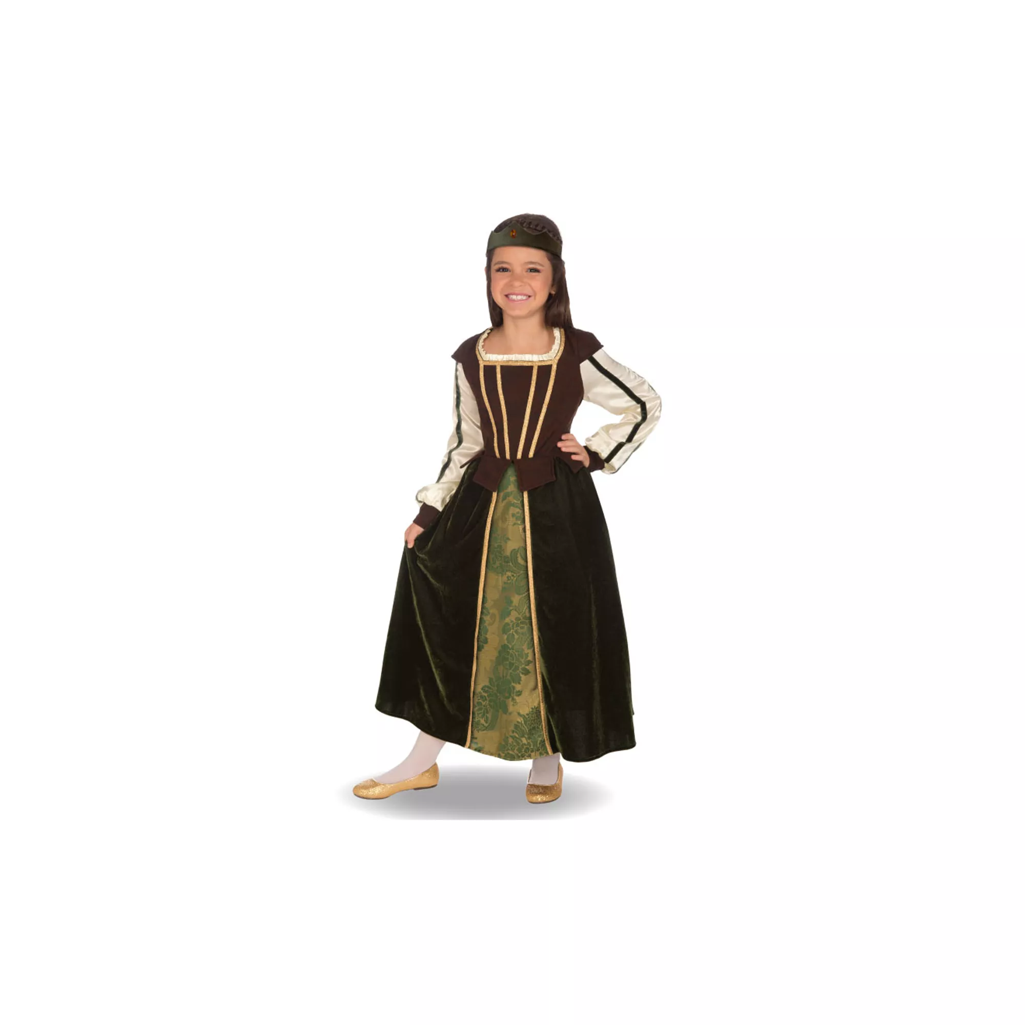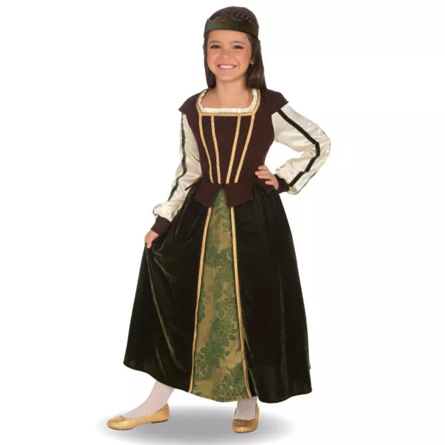 You'll shine brighter than the queen in this Maid Marion Child Costume. The townspeople will love you in this faux velor green vintage gown with ruffle collar and matching crown.
