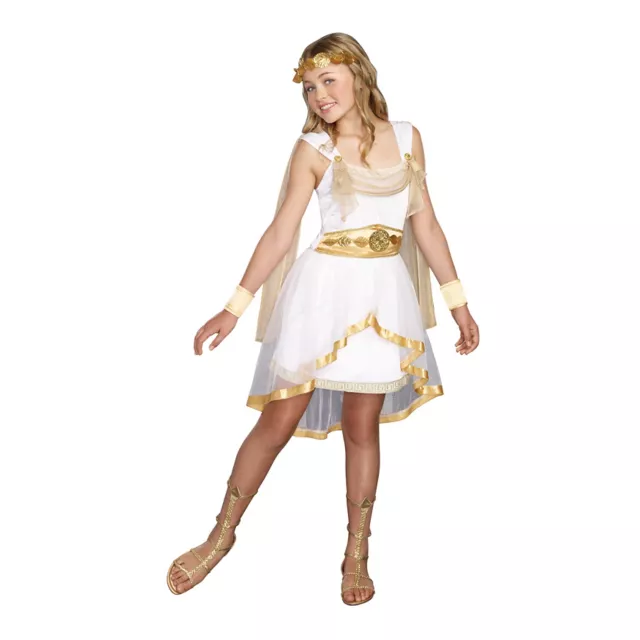 Coat yourself in riches while wearing this Miss Olympian Girl's Costume! Rule over Olympia with this short tank dress overlaid with beautiful white tulle around the skirt lined by gold accents and featuring drapery along the neckline. The dress reaches mid-thigh with an attached gold cape and strong belt around the waist. Bring out your Greek goddess with the golden laurel headpiece fit for a true beauty and matching Olympian wrist cuffs. All you need are a pair of wrap sandals (sold separately) and your costume will be complete!