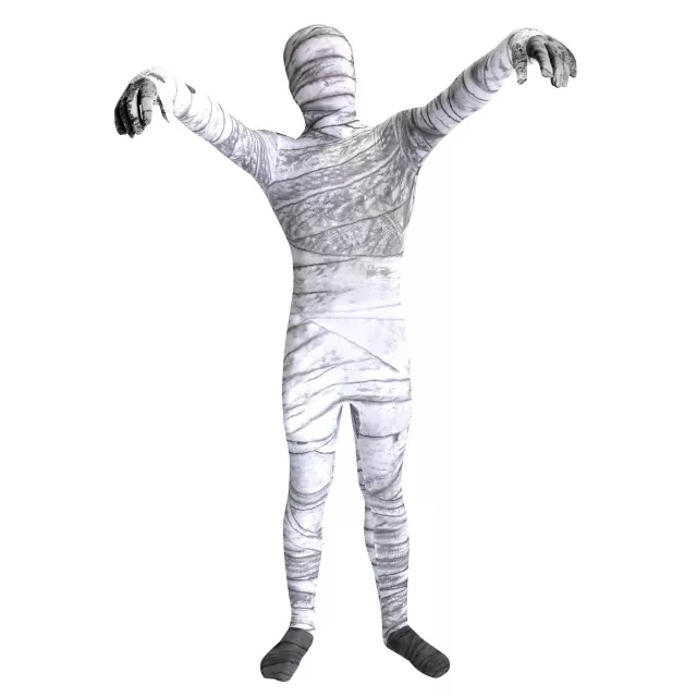Rise to life on Halloween when you walk the streets dressed in the Mummy Skin Suit Child Costume. This see-through and breathable skin suit features a mummy bandage design along with blood spatter details, complete with a double zip, reinforced closure.