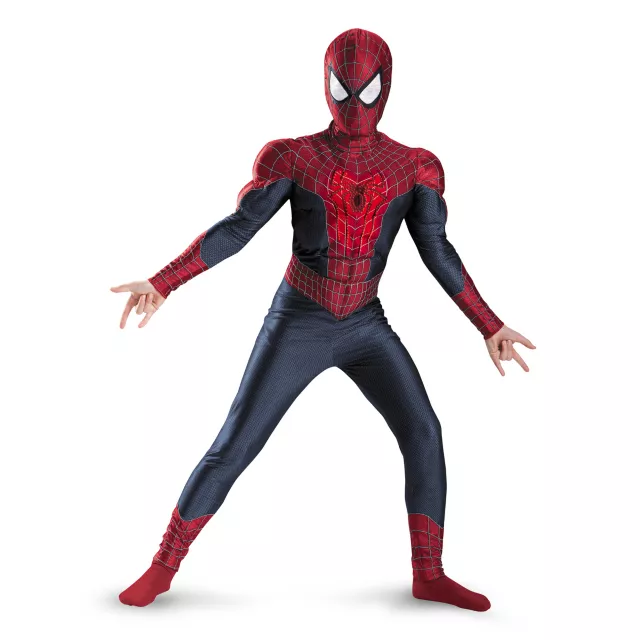 Swing into action on Halloween when you wear the officially licensed Spiderman Muscle Light-Up Boys Costume, This red, blue and black muscle chest jumpsuit features built-in fiber-optic lights and comes complete with a matching character hood.