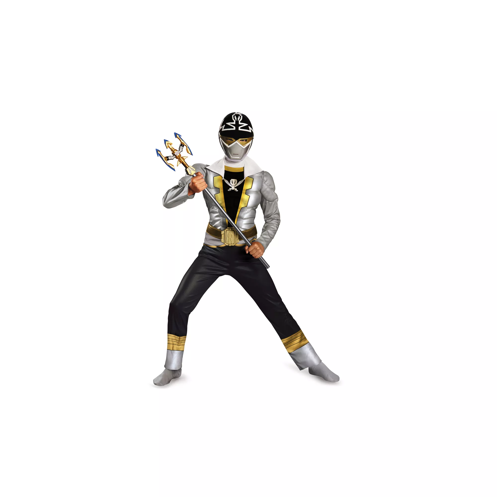 Power up your Halloween with the officially licensed Power Rangers Silver Power Ranger Muscle Jumpsuit Child Costume. This silver, black and gold jumpsuit features muscle torso and arms along with character details, complete with a belt, buckle and character mask.