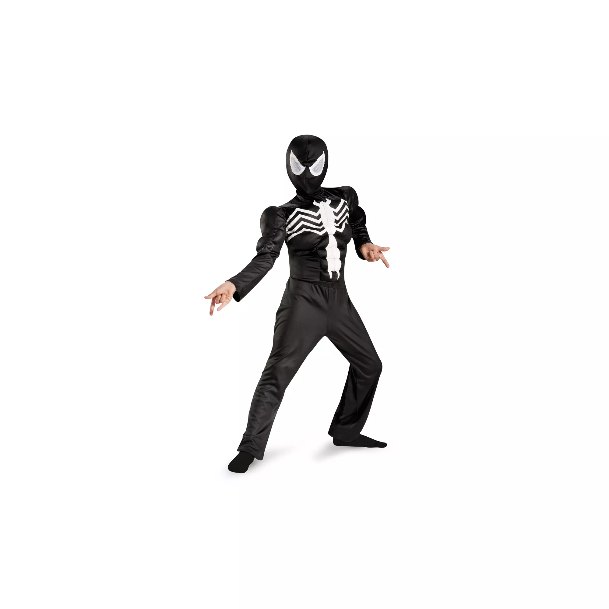 Unleash the evil side of Spidey when you decide to wear this officially licensed Spiderman Ultimate Black Muscle Child Costume. The black and white jumpsuit features a muscle torso and arms, complete with a matching character hood.