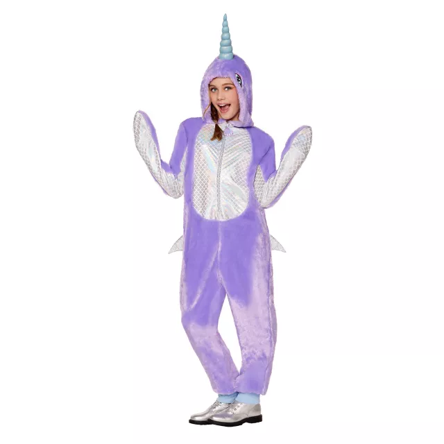 Head out to sea in style when you dress in this kids' narwhal jumpsuit costume! This costume features plush fabric in a stunning shade of pale purple, and a belly and tail featuring an iridescent scale print. An attached hood features narwhal eyes and a twisted horn. A seashell zipper pull adds a playful touch to this narwhal costume.