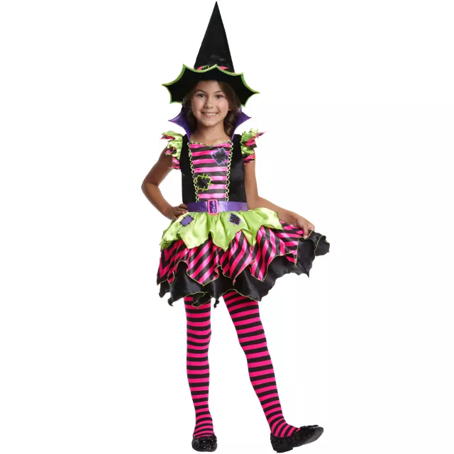 Brighten up Halloween when you wear this colorful Neon Patch Witch Girls Costume. Black, pink, purple and green dress comes complete with a matching witch hat. Add a broom and some tights to complete your look!