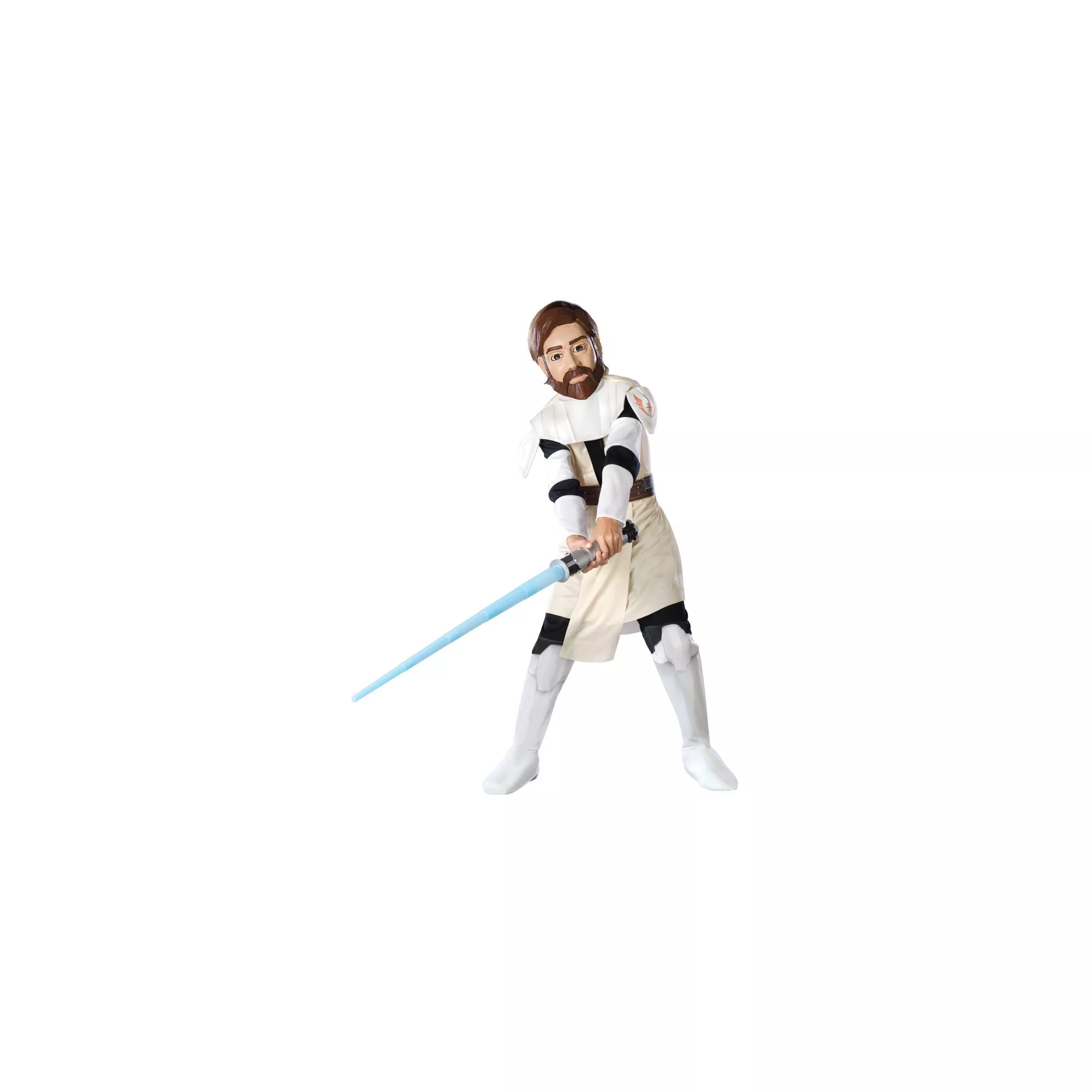 Be a Jedi Master on Halloween when you don this officially licensed Star Wars Clone Wars Obi Wan Kenobi child costume. The 100% polyester, beige tunic comes complete with brown pants with attached boot tops, a beige belt and a character mask.