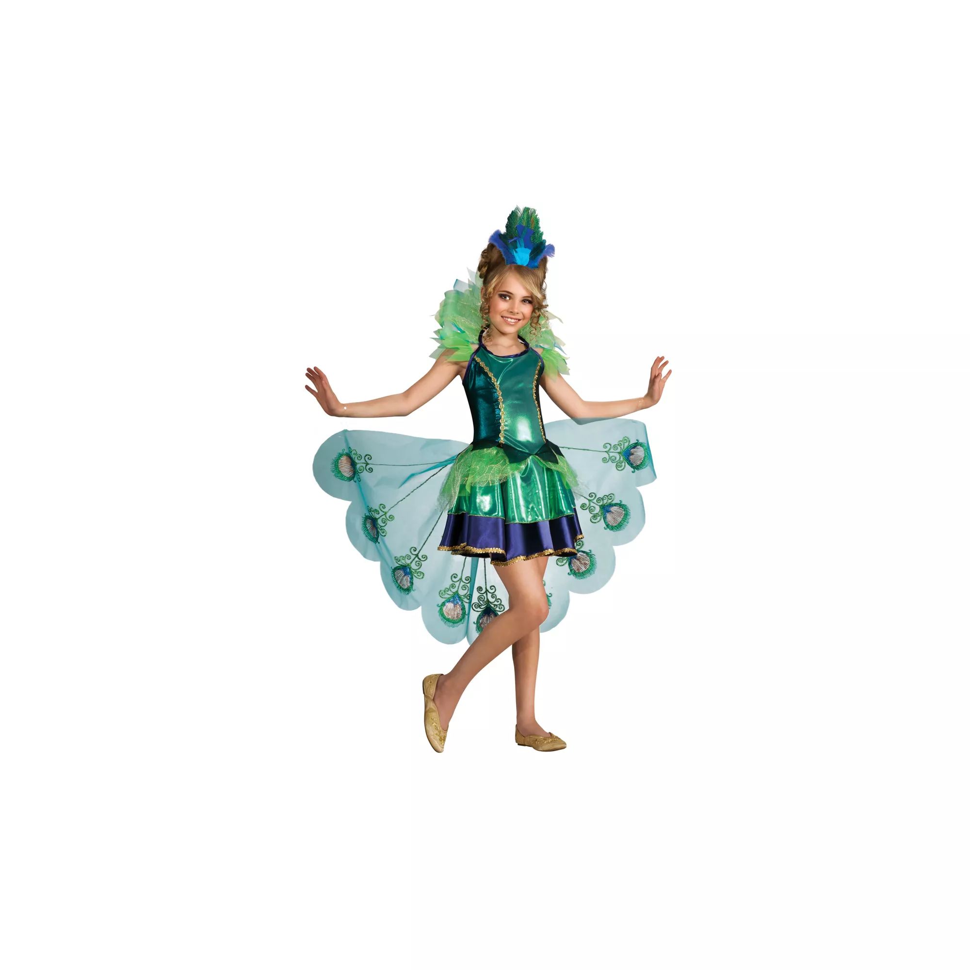 Spread those elegant wings and fly door to door on Halloween wearing this Peacock Girls Childs Costume! Colorful dress and wings display vibrant colors of indigo, aquamarine, and emerald, with hints of gold embroidery at the front and the hem of the dress. Feathery headpiece also included to top off your look.