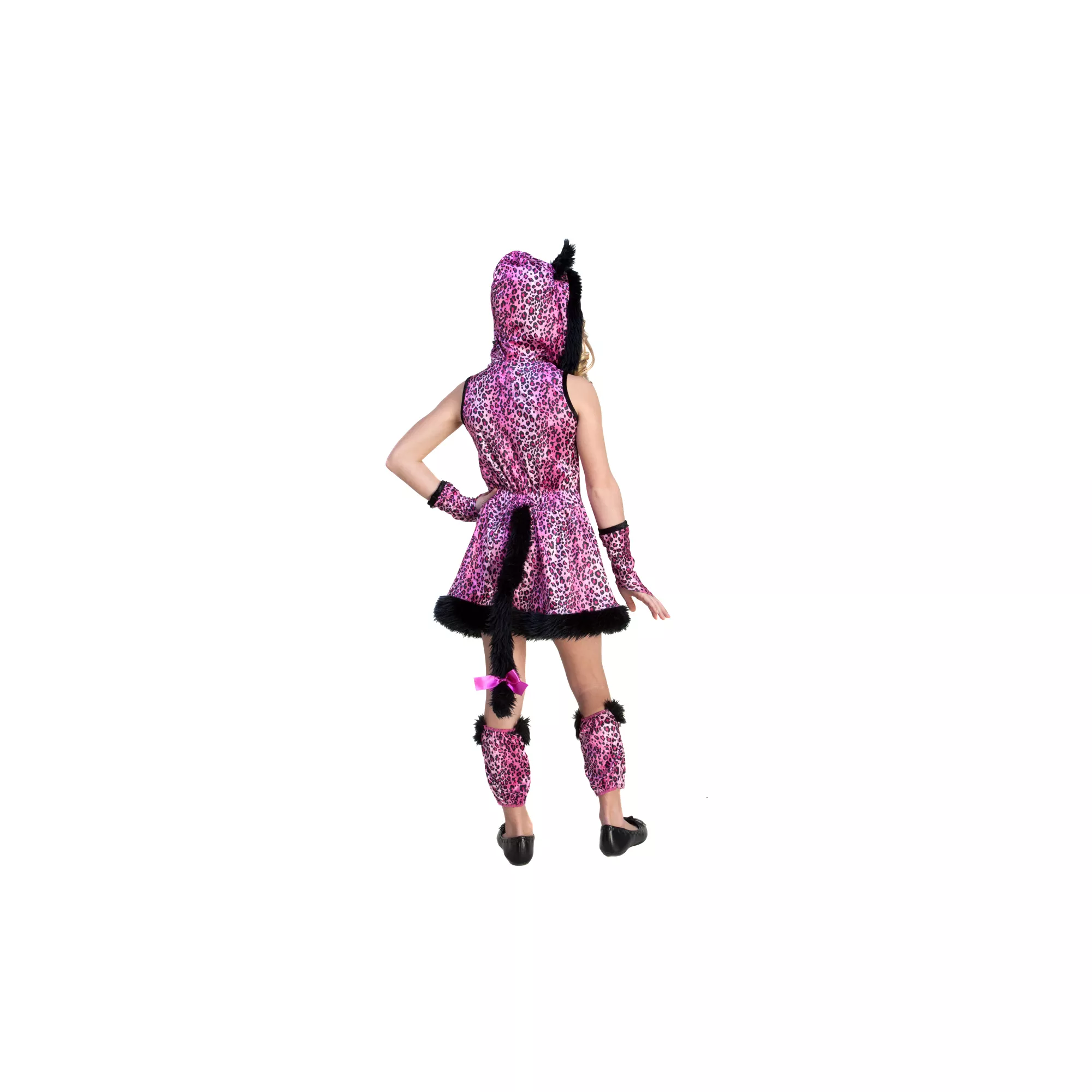 Have a purr-fectly magical Halloween when you prowl the neighborhood in the Pink Kitty Girl's Costume. Practice your best hiss when you wear this spunky hot pink leopard print dress featuring and plush black fur lining, an adorable cat eared hood and attached tail. Complete the feline fun with the included leg warmers and gloves.