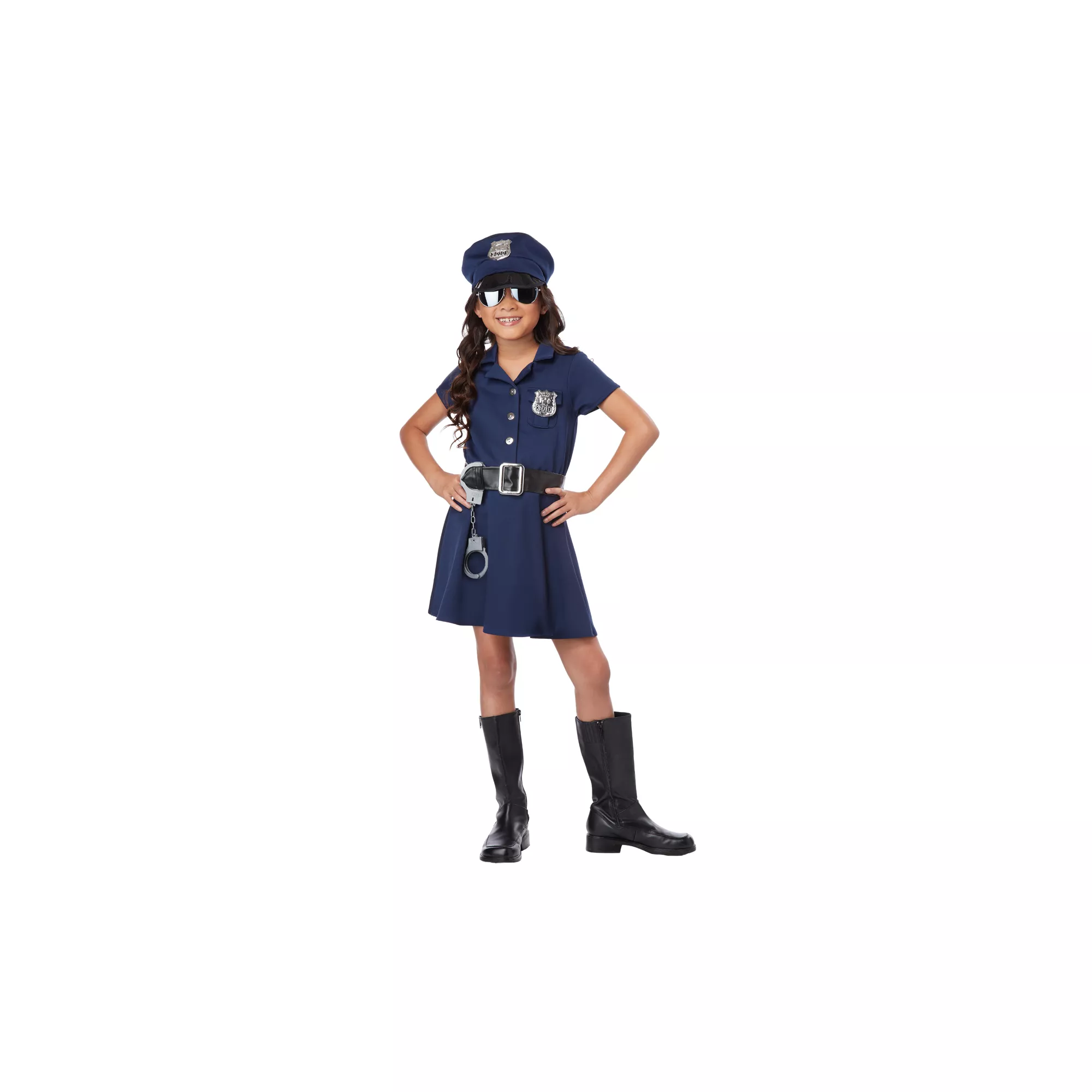 Keep all those crazy trick-or-treaters in line when you wear this Police Officer Girls Costume. Classic navy blue, silver button collared dress with black pleather buckle belt, signature police cap with visor, handcuffs and official badges included.