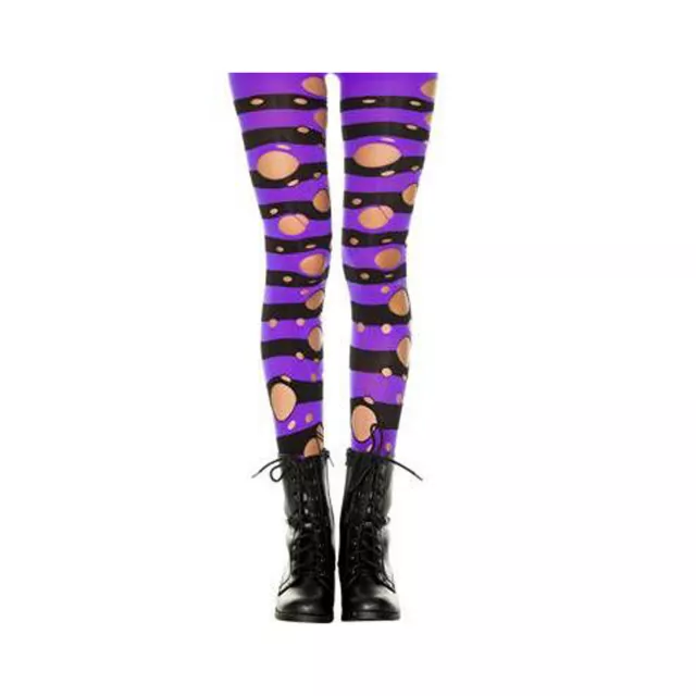 Get into trouble on Halloween wearing these Purple Black Ripped Striped Tights. Bright punk style stockings are the perfect addition to a silly witch or punk costume.
