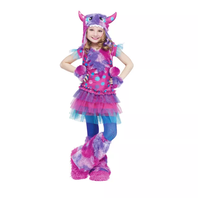 Act monstrously on Halloween when you don this Dizzy Lizzie Purple and Pink Monster child costume. The vibrant outfit includes a mesh skirt, leg cuffs, mitts and a fantastic character hood with horns and pom poms.
