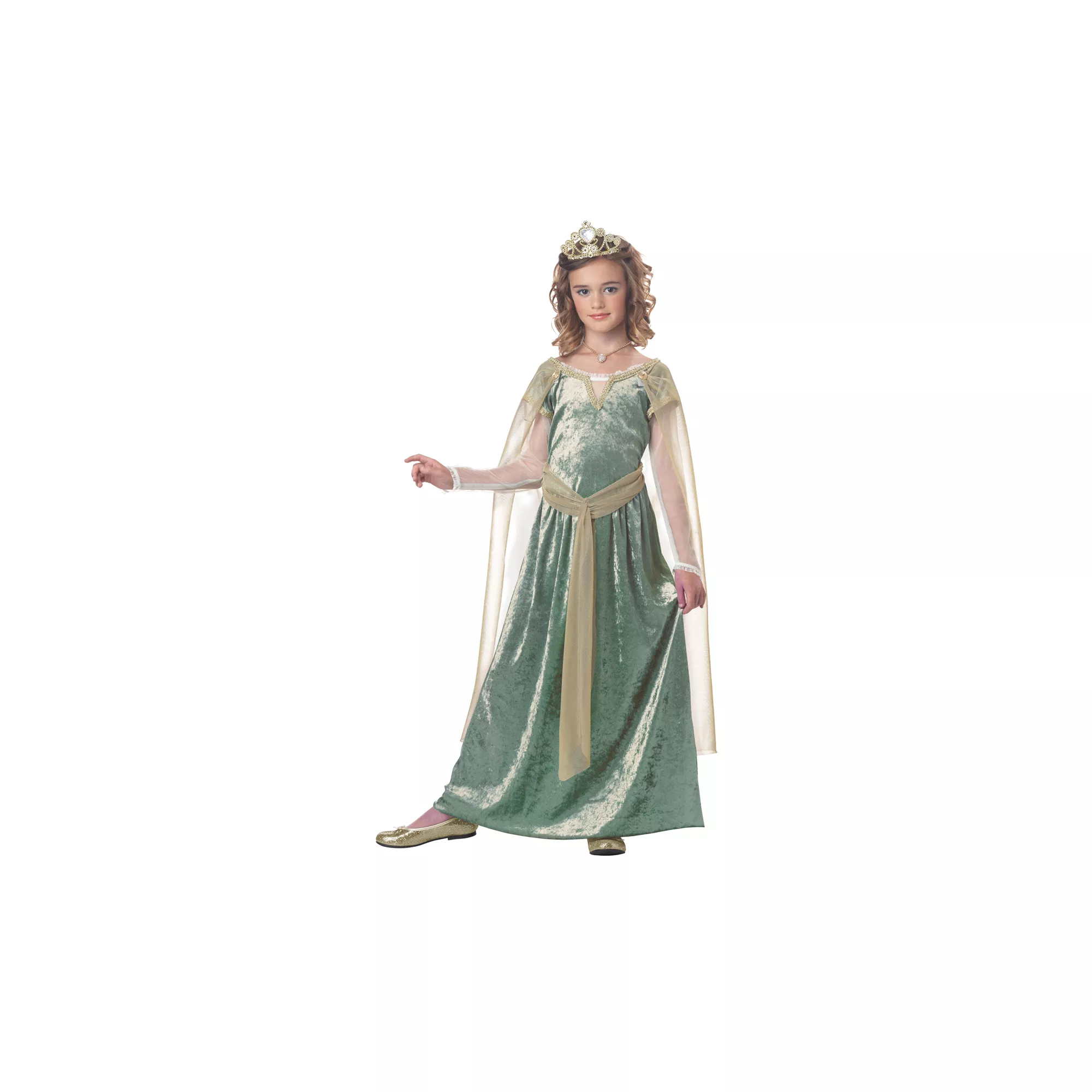 Make whatever orders and commands you will on Halloween dressed in this Queen Guinevere Child Costume. It's not out of line if you're just playing the part! Costume includes faux velour teal green gown with silver detail, detachable sheer cape, matching tied belt, and a crown as every queen should wear upon her royal head.