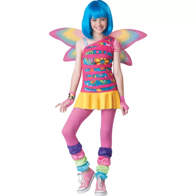 Flit and flutter around the neighborhood in full bloom color when you wear this Rainbow Fairy girls costume. The incredibly cute one shoulder dress features shredded print and comes complete with leg warmers and fairy wings.