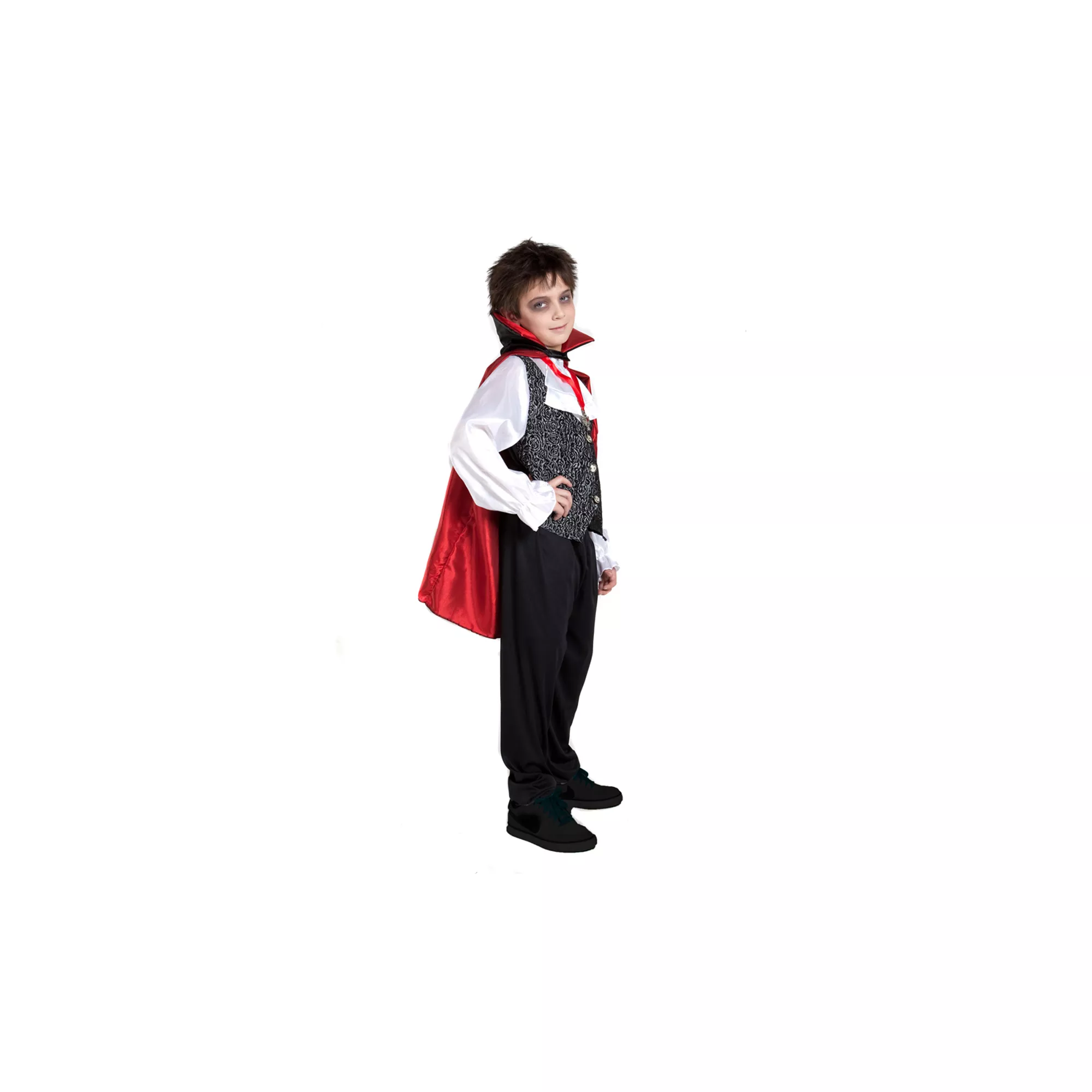 Sink your teeth into this classic boy's Vampire costume for a bloody fun Halloween! The handsome costume is rich with period detail including a faux brocade vest and jabot shirtfront and a shiny midnight-black cape with blood-red lining, all adding up to create a compellingly creepy costume!