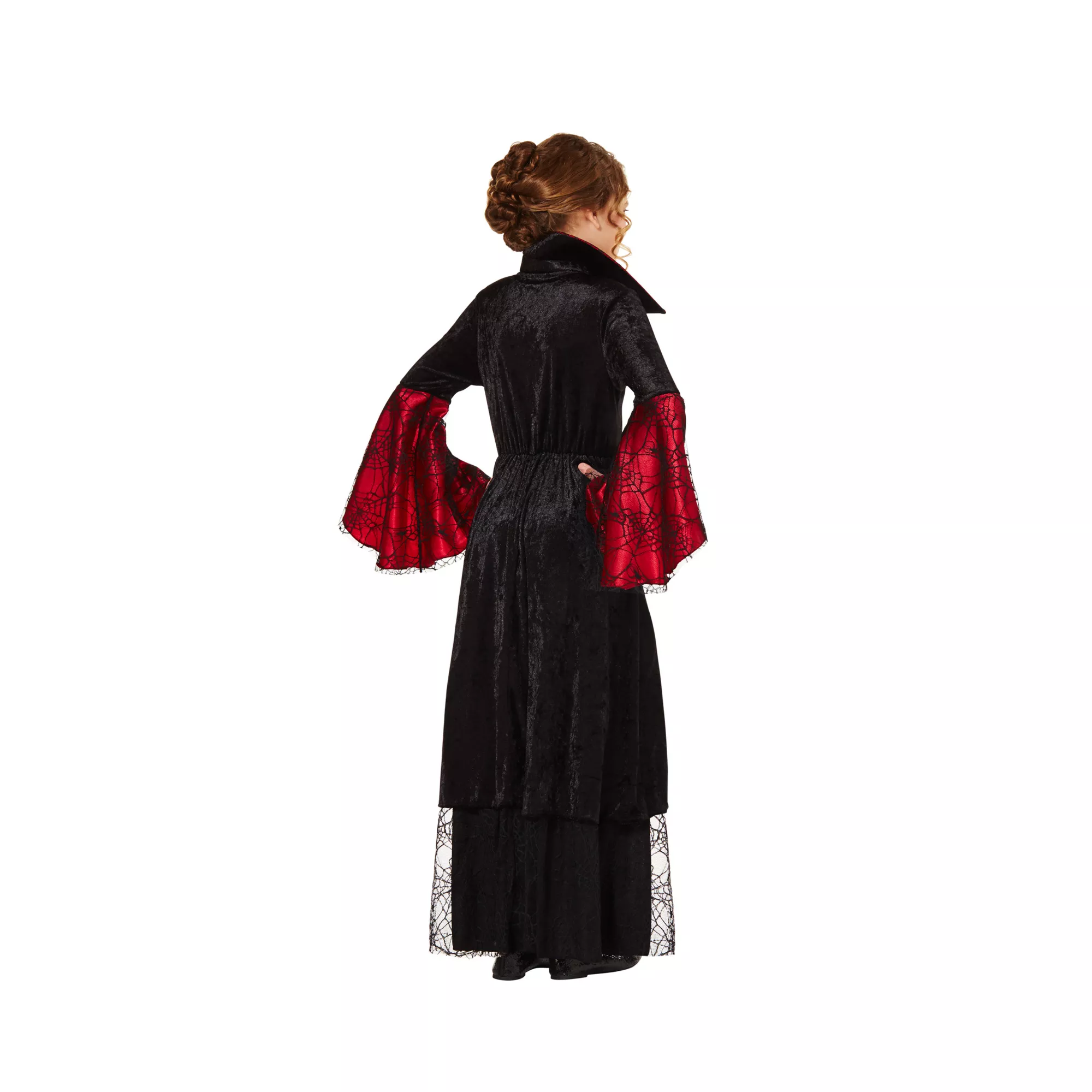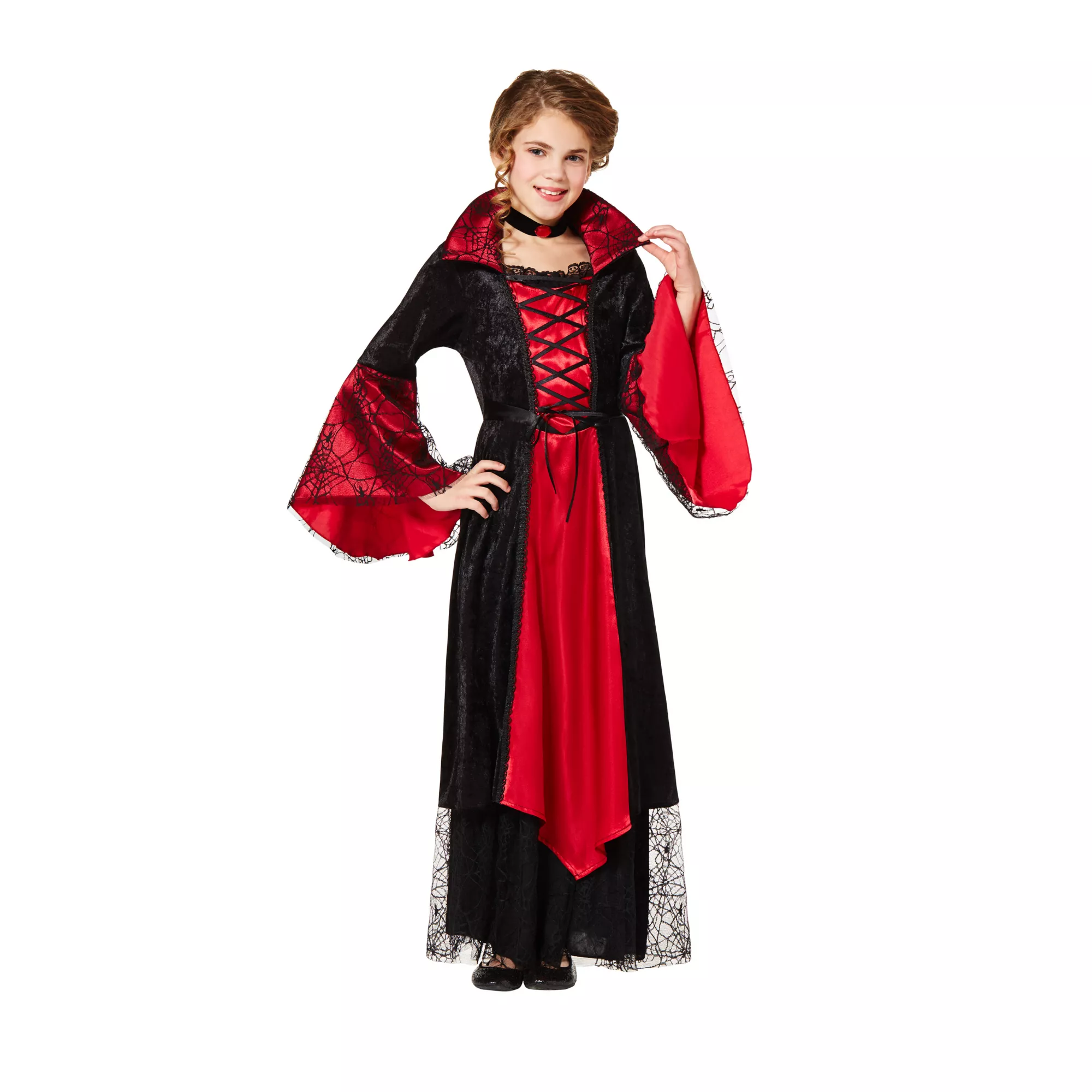 Stay up all night in this gorgeous Red Vampiress Deluxe child costume. The blood-red and jet-black dress is styled in a grand Gothic fashion that makes it looks as if you walked from the shadows and into the party. Dance the night away, but beware of morning.
