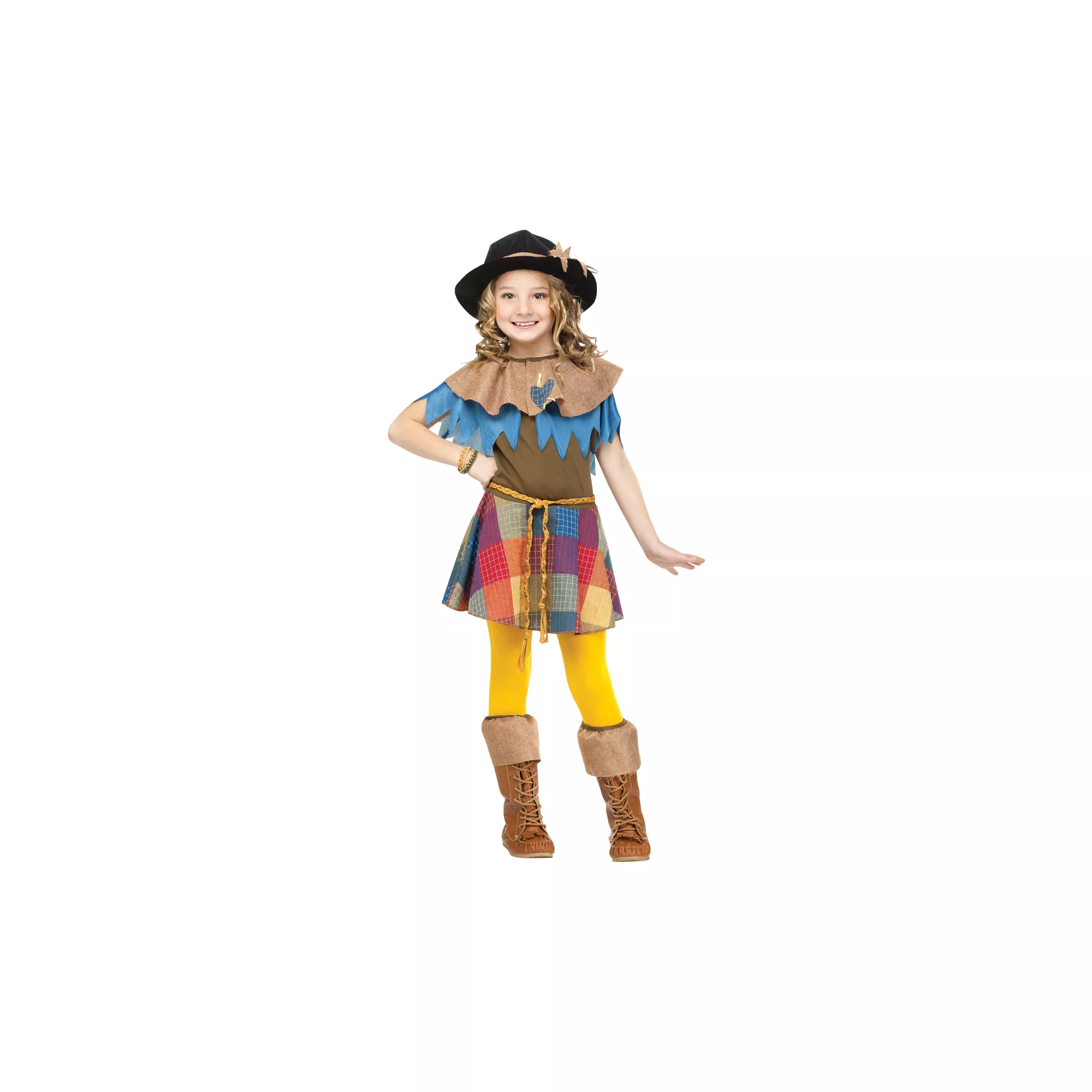 She may not scare the pests from your yard but she'll look dandy in this Scarecrow Girls Child Costume. Your neighbors will think this scarecrow was so cute that she came to life in this dress with patch printed skirt, burlap layered collar with blue jagged edge and heart patch, farmers hat with hay detail, braided hay textured belt, and burlap patterned boot tops.