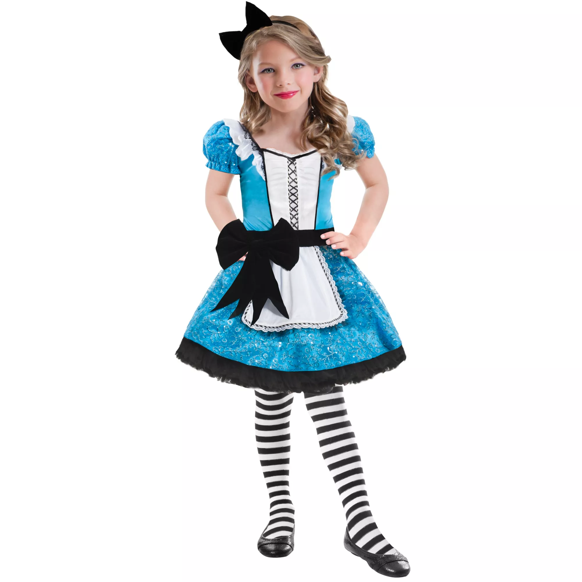 Look perfect for any tea party, even a mad one, in this Alice Child Costume! This bright blue dress features adorable capped sleeves and a puffy blue skirt with swirling sequin details, as well as a black tulle underskirt. The top features white and black lace-up and lace details, as well as a large black bow around the waist with a matching bow headband! Pair with some stripped tights (sold separately) for a full Alice look that will make it feel like Halloween is your unbirthday!