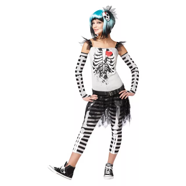 Finally a skeleton that's not scary! This Skela Bella Girl's Costume is completely cute and perfect to wear for any costume party! Skeleton print dress comes complete with matching pants, arm warmers and an awesome headpiece.