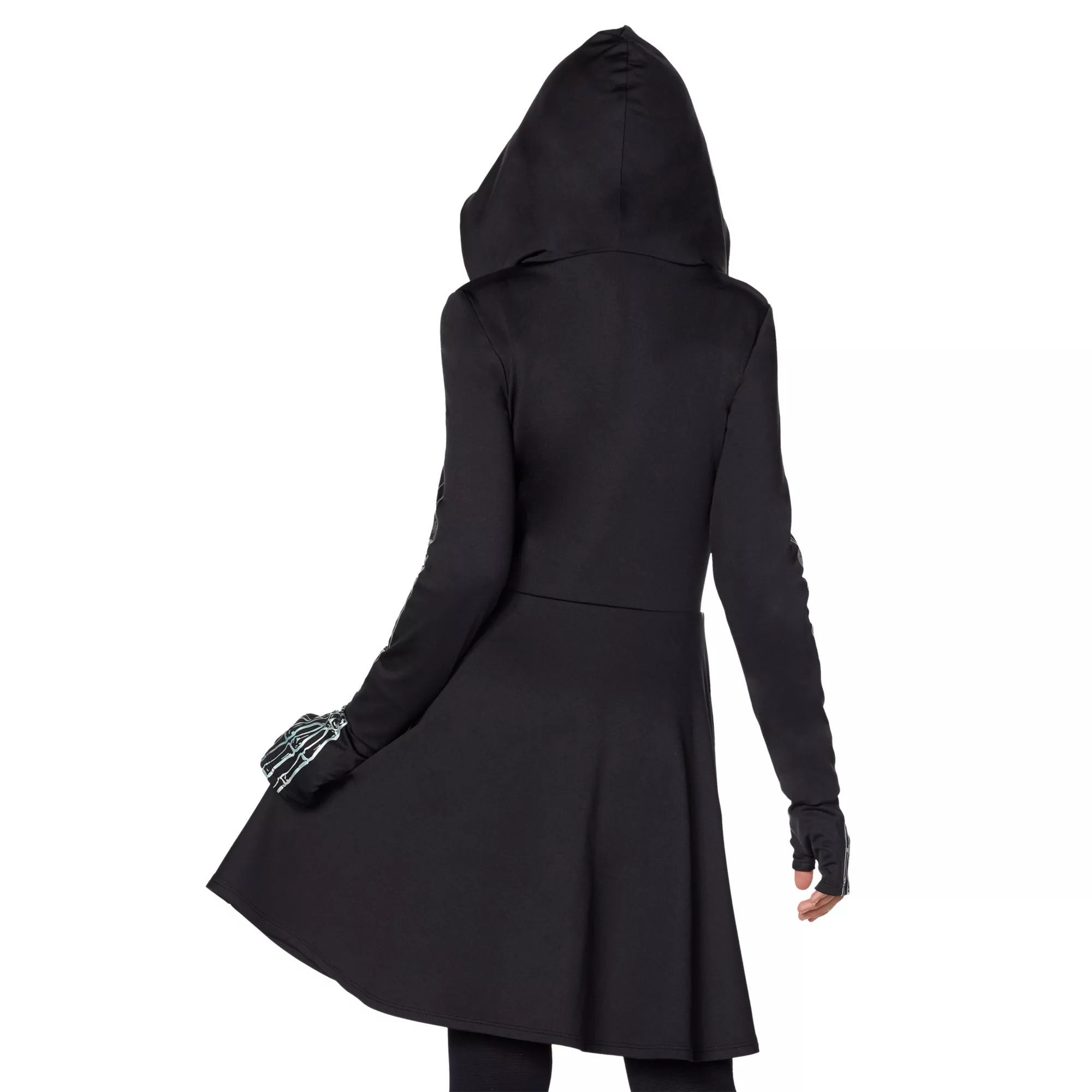 Combine creepy and cute on Halloween with this spooky hooded dress! This bony black dress features skeletal detailing and is topped with a hood to complete your grim look. Have some frightening fun on Halloween night with this haunting hooded dress!
