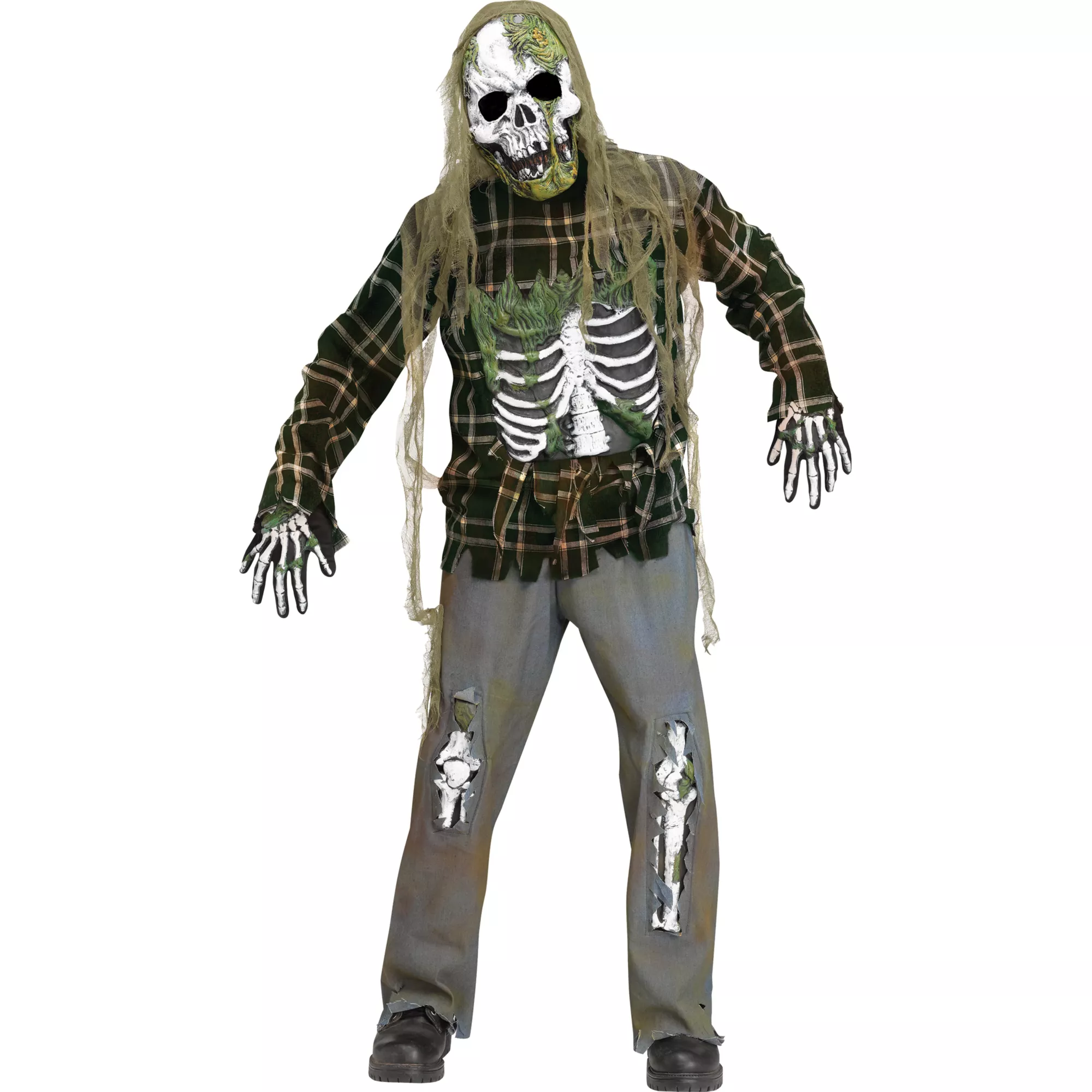 Do the monster mash when you wear this Skeleton Zombie child costume. The green and tan, 100% polyester tattered shirt features white chest bones and comes complete with matching pants, gloves and a very gruesome mask with long hair.