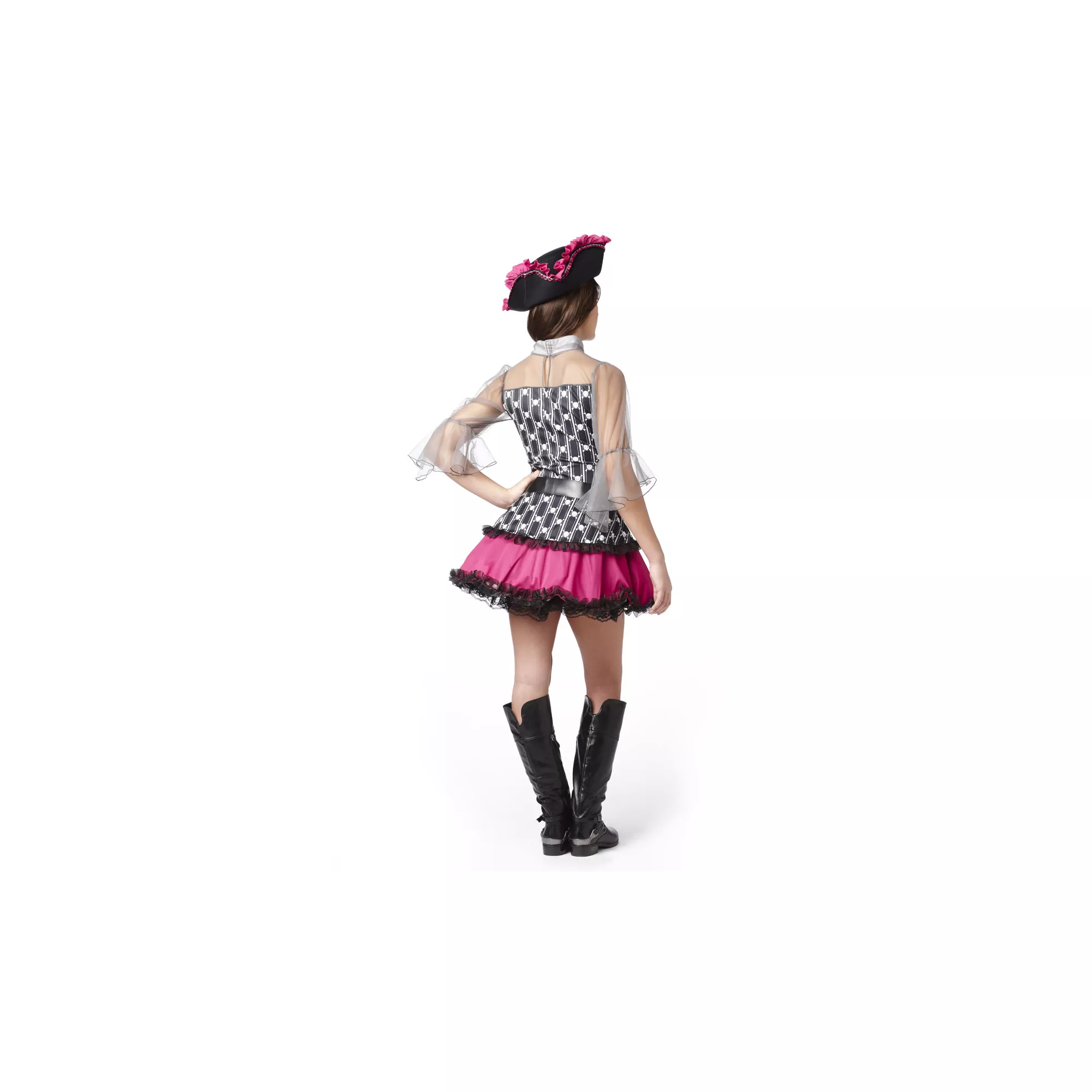 Make them all walk the plank on Halloween when you wear this fiercely cute Skull Pirate Girls Costume. Black, white and pink dress features sheer sleeves and comes complete with a black waist belt and matching pirate hat.